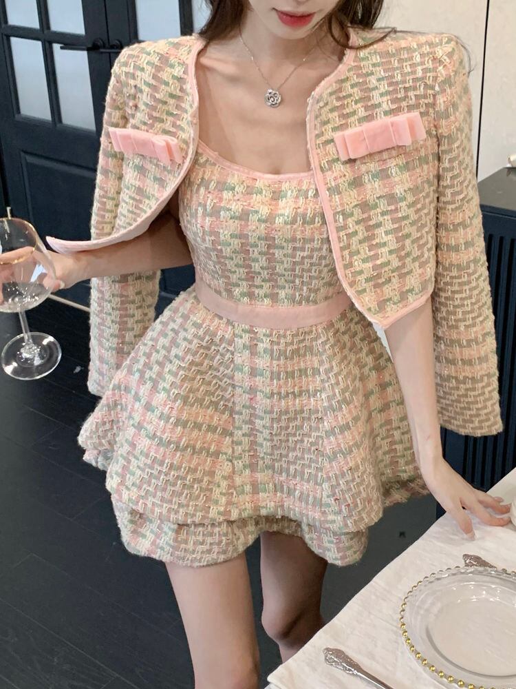 小さなフレグランス ツイード ツー ピース セット女性ショート ジャケット コート + セクシーなドレス セット甘い 2 ピース スーツ 大人ガーリー スウィート キュート カジュアル mes50001946458