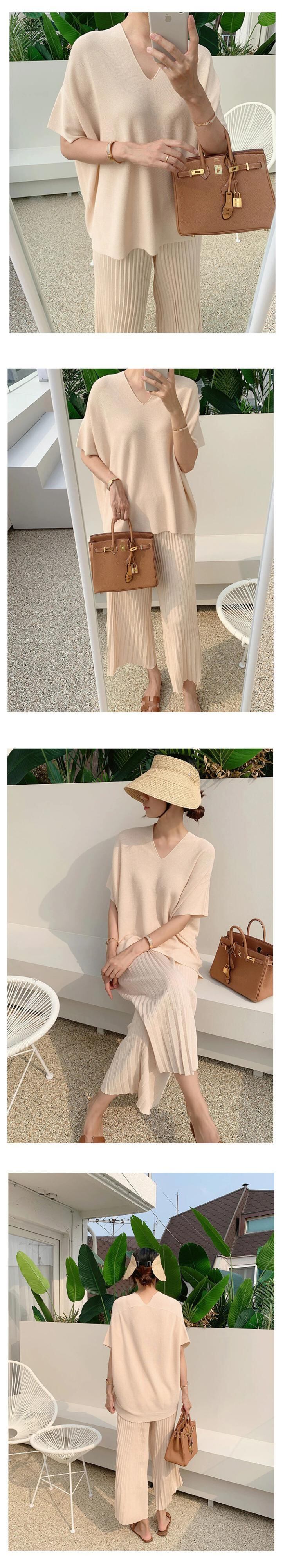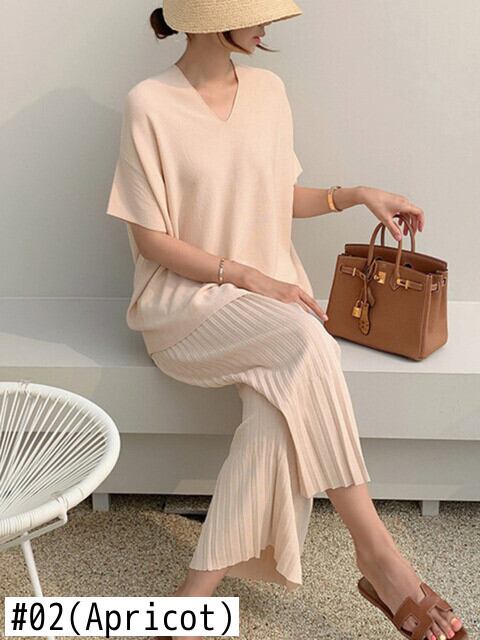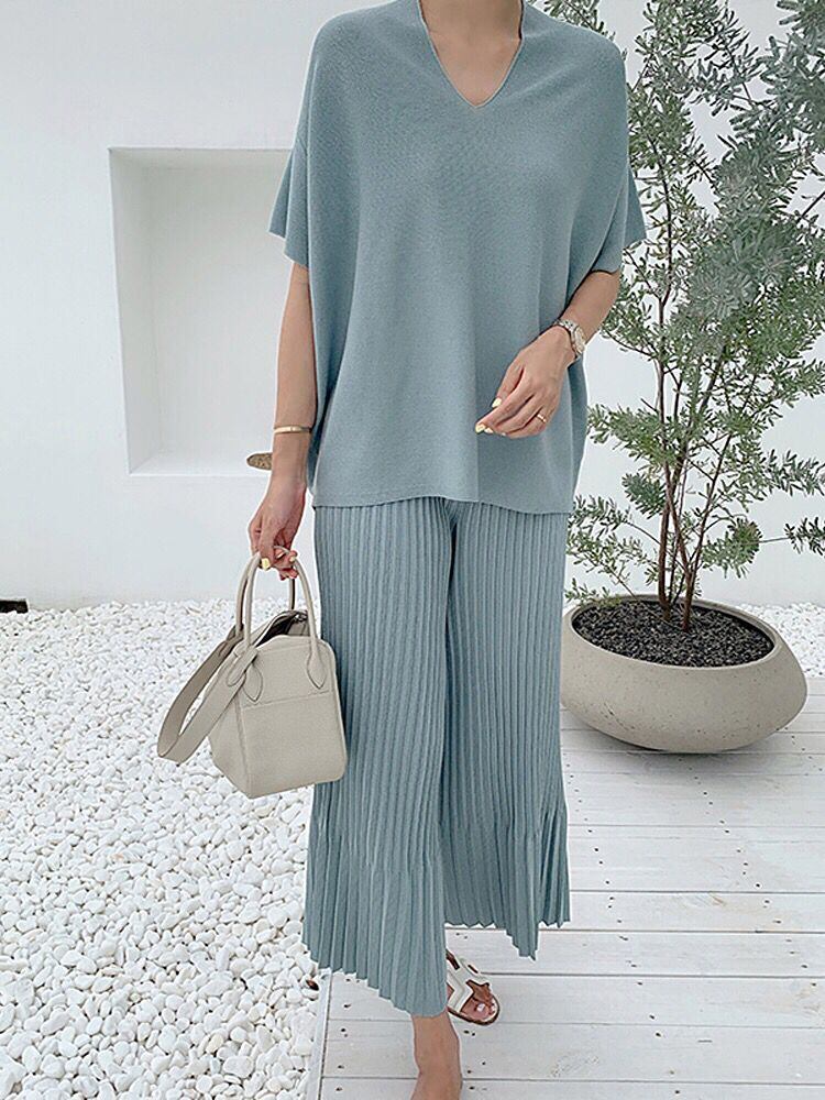 夏ニット 2 点セット女性ルース プルオーバー セーター トップス + ワイドレッグ パンツ スーツ ニット 2 点セット サマー 夏物 ワイドパンツ mes42186969992