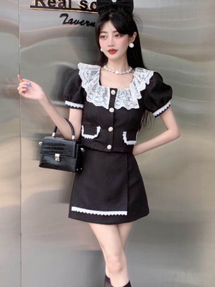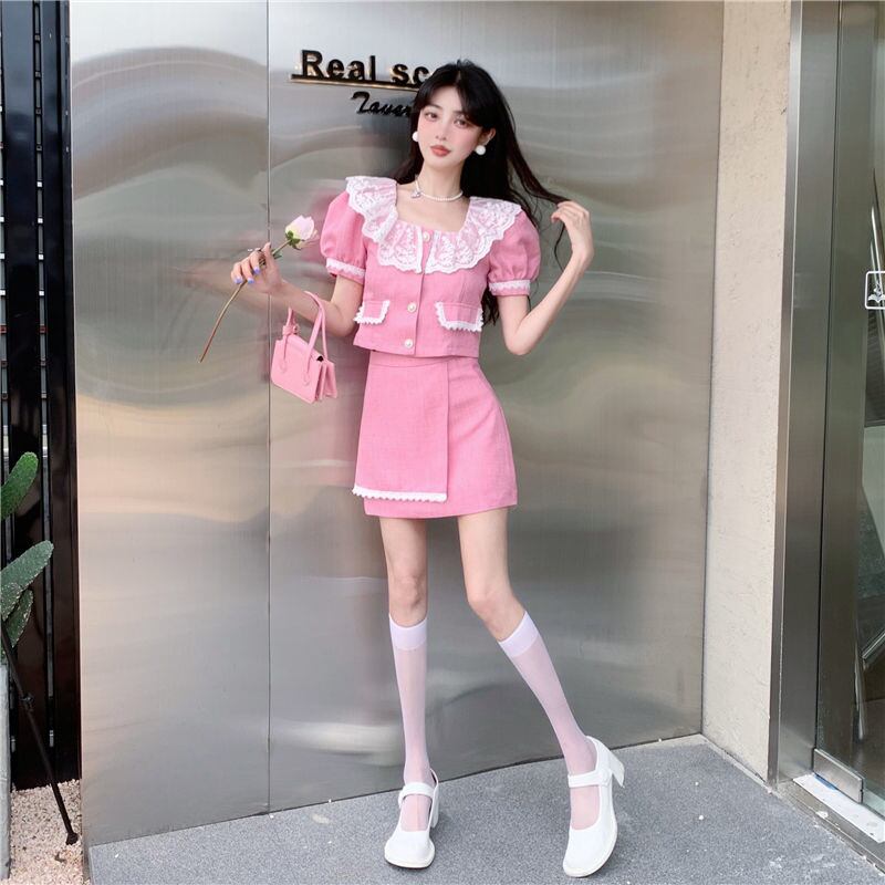 小さなフレグランス 2 点セット女性ジャケット コート クロップ トップ + 非対称スカート スーツ夏甘い 2 点セット 大人ガーリー スウィート キュート カジュアル サマー 夏物 mes22660269775