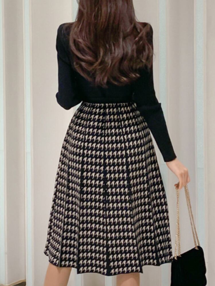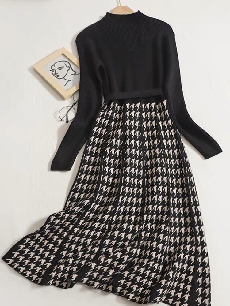 春ニットチェック柄パッチワーク女性ドレス長袖レースアップ弓プリーツドレス Vestidos ロング リボン スプリング 春物 mes25290911201