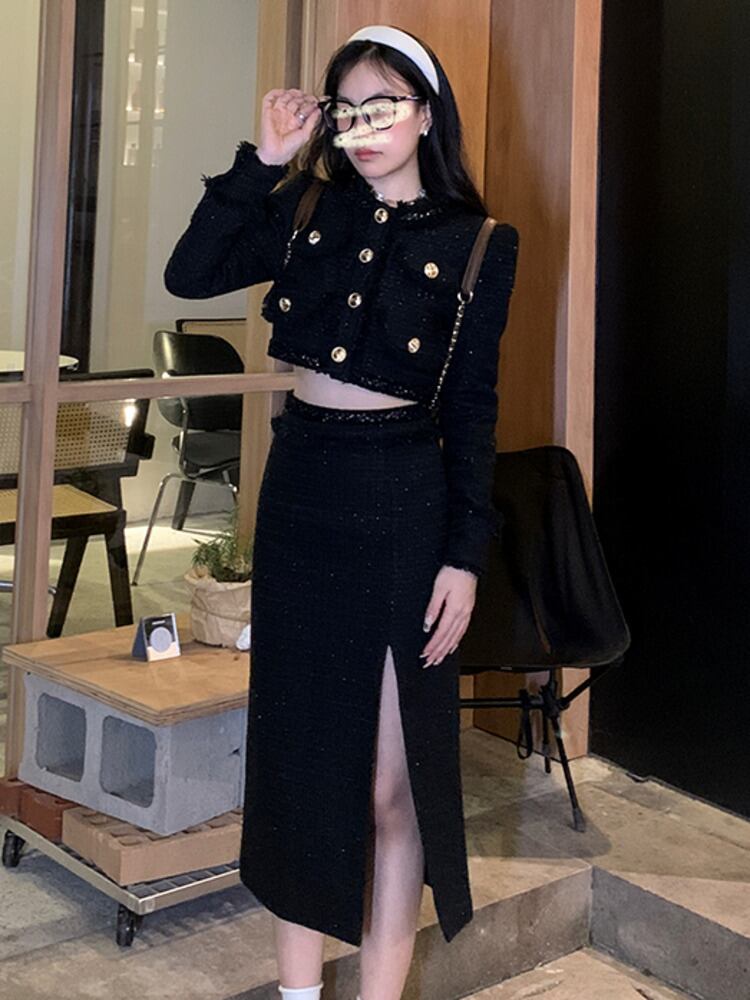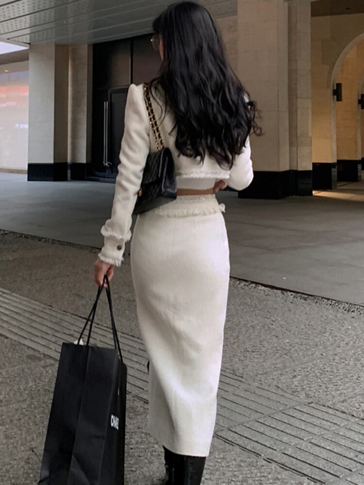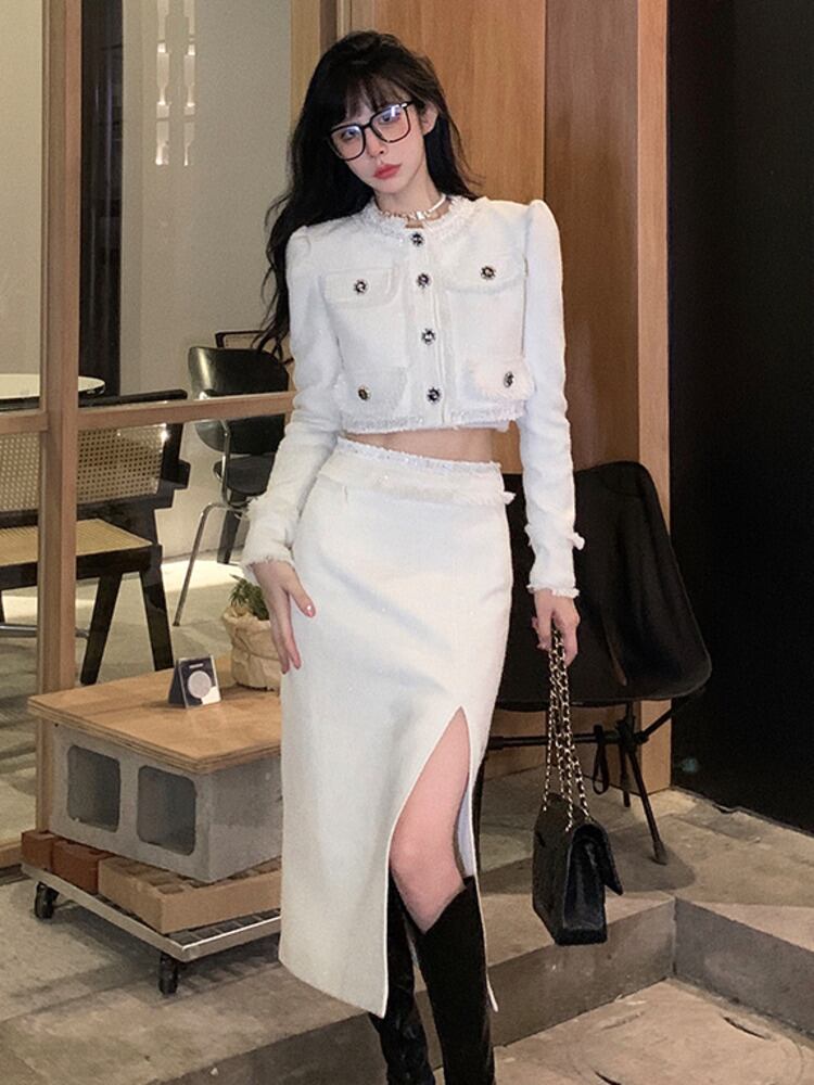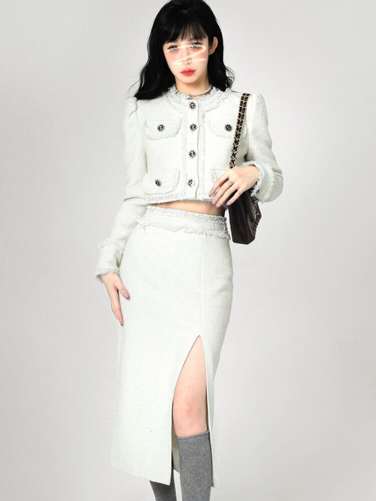 小さな香りツイード 2 点セット秋冬ショート ジャケット コート + ロング スカート スーツ 2 点セット女性衣装 ウィンター 冬物 mes42658494574