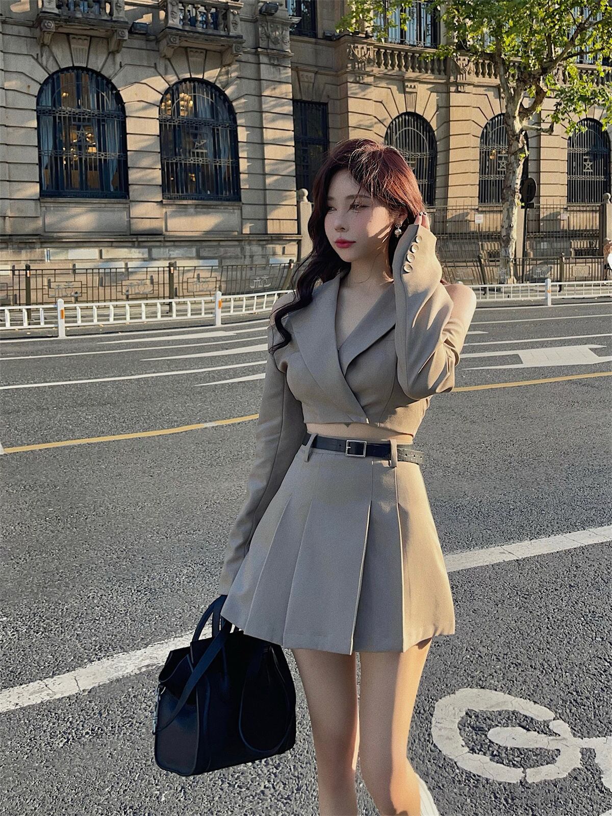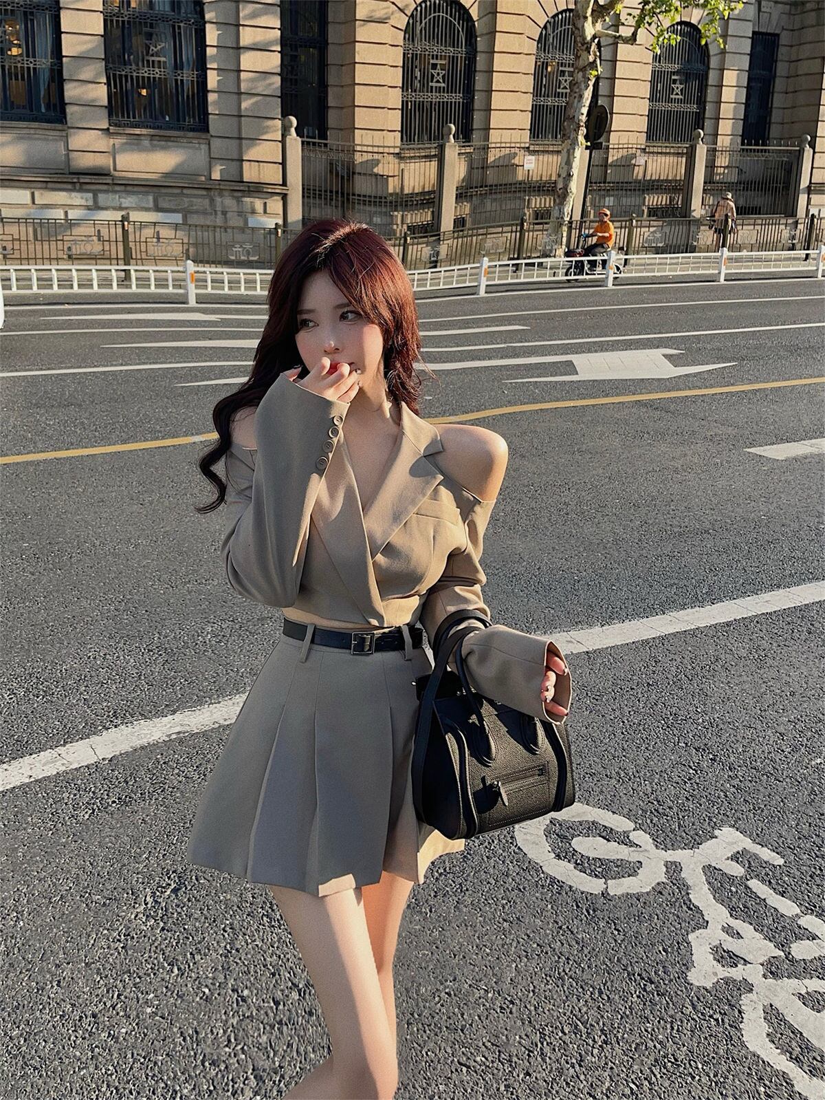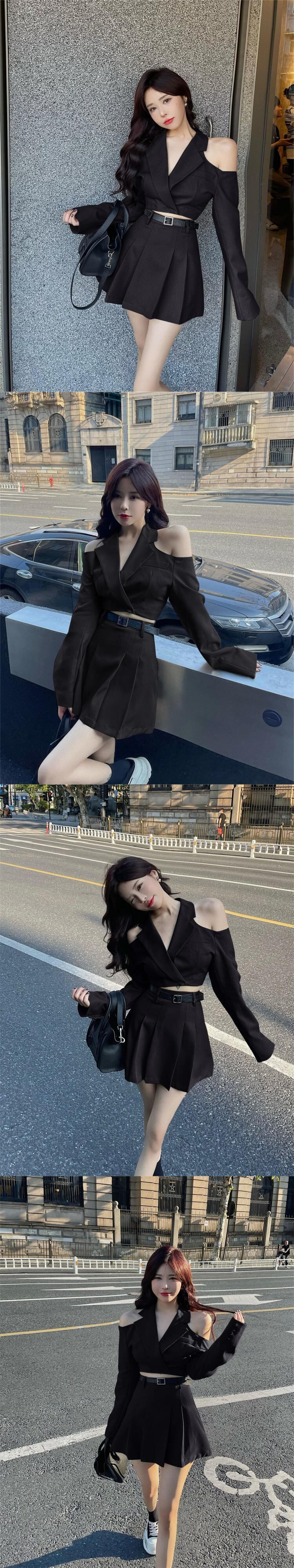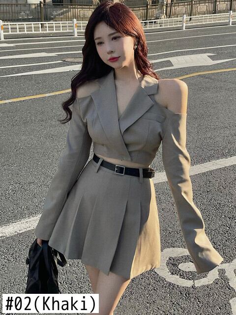 秋フライドストリート 2 点セット女性オフショルダーセクシーなスリムショートブレザーコート + ウエストプリーツスカートツーピーススーツ オータム 秋物 mes54106368184
