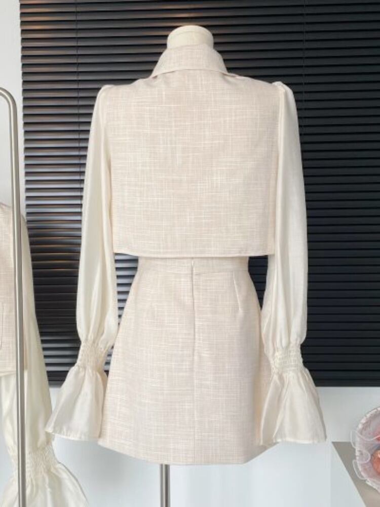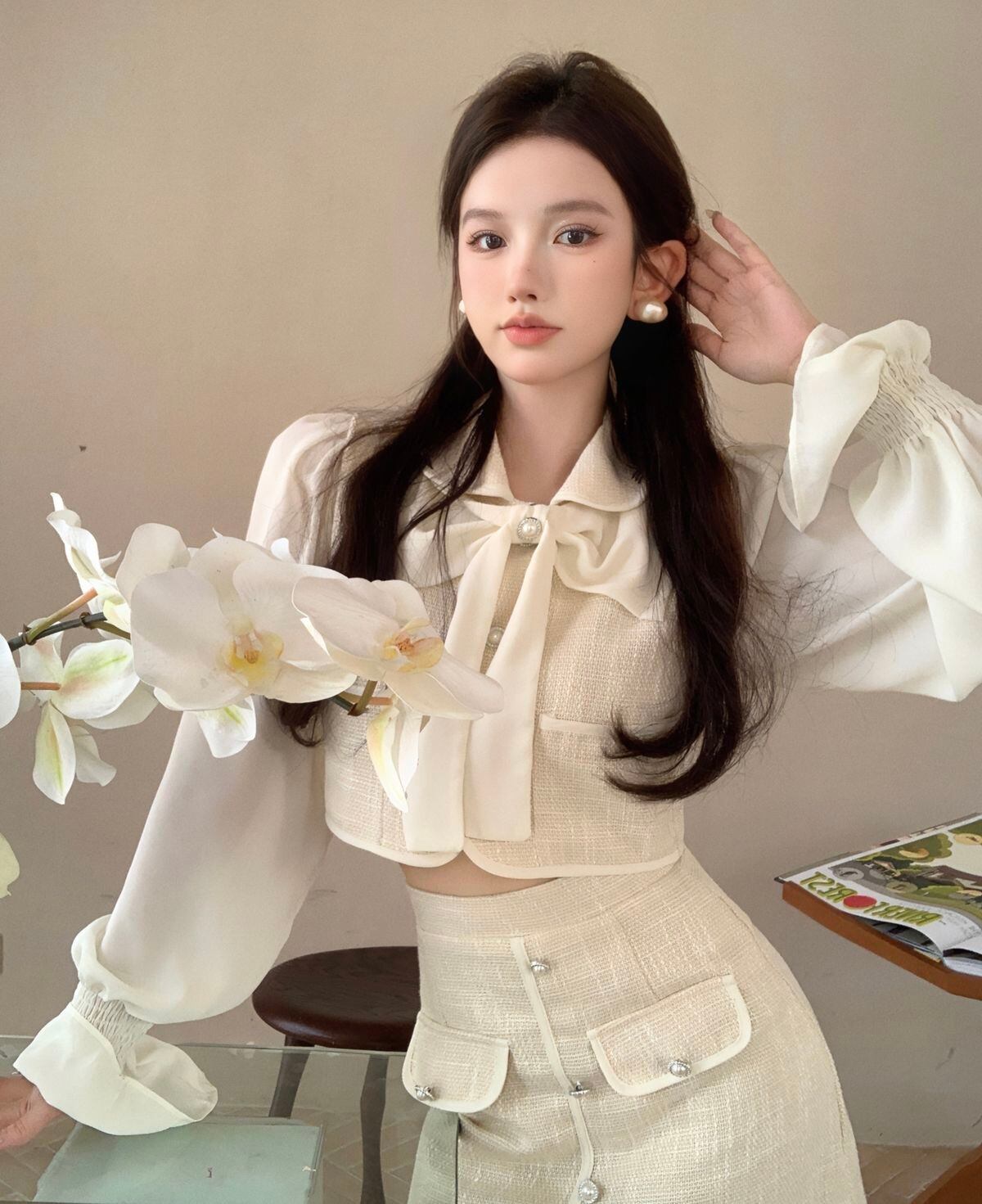 秋の甘い 2 点セット女性蝶ネクタイパッチワークシャツクロップトップ + ウエストスカートスーツ小さな香り 2 点セット リボン 大人ガーリー スウィート キュート カジュアル mes21524356110