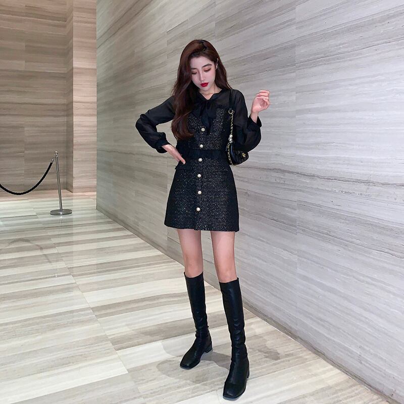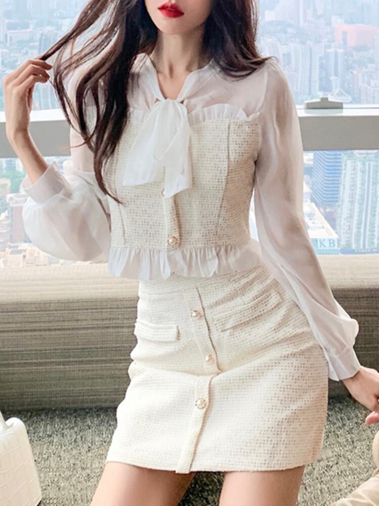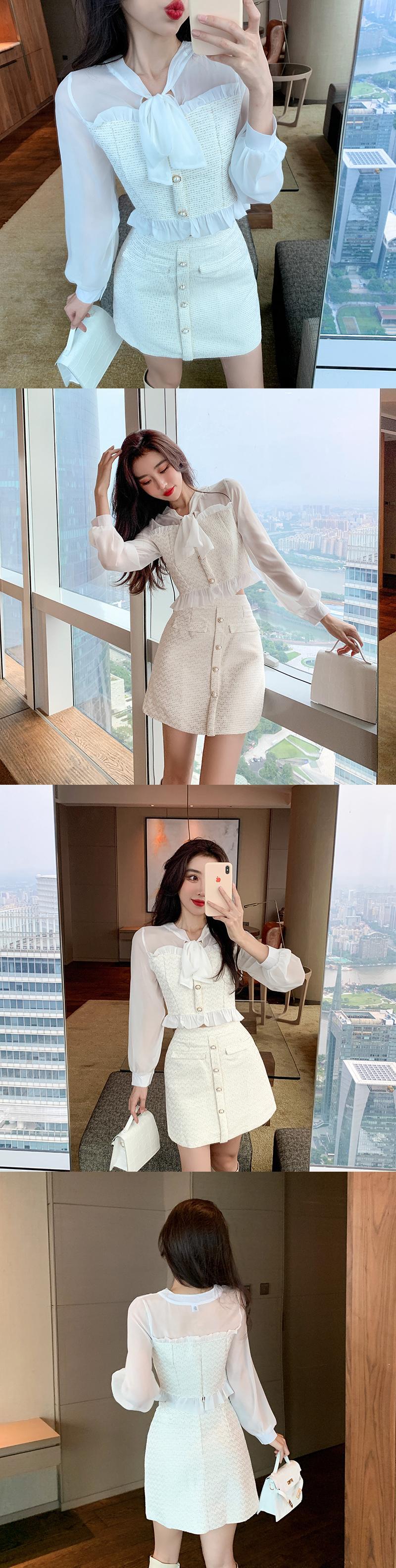 春秋の甘いツーピースセット女性弓ツイードパッチワークシフォンブラウスシャツトップ + ミニスカートスーツ リボン 大人ガーリー スウィート キュート カジュアル スプリング 春物 オータム 秋物 mes21711146762
