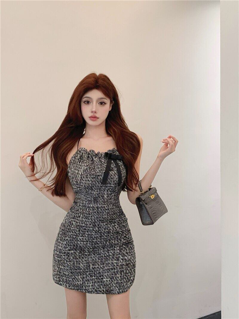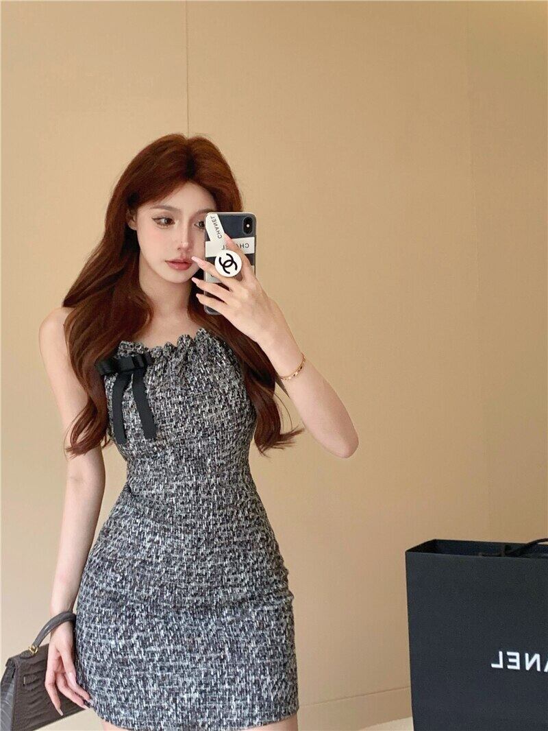 フレンチスモールフレグランスツイードドレス女性ボウサマードレスローブノースリーブセクシーなサンドレス リボン 夏物 mes45840599390