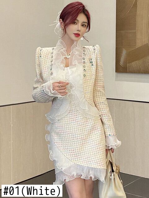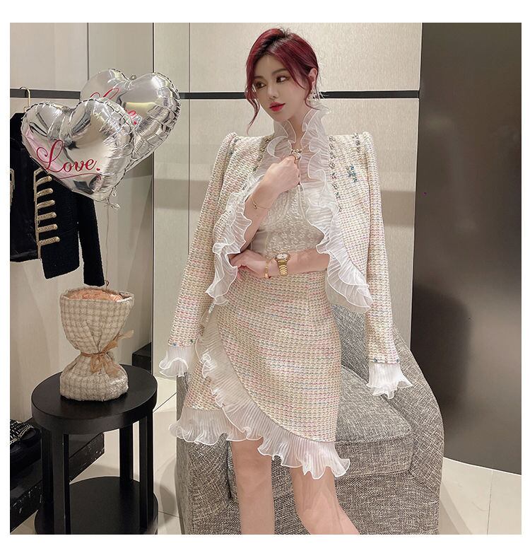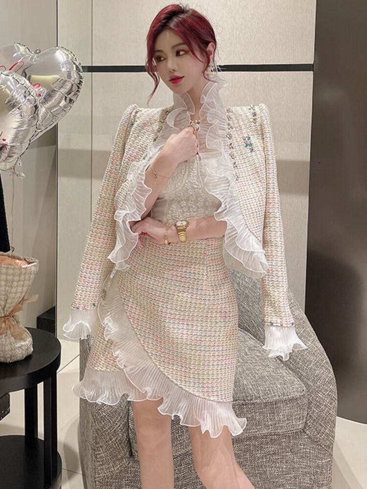 高級ビーズ ツイード ツー ピース セット女性ウール ショート ジャケット コート + スカート スーツ フリル 2 ピース衣装 ラッフル mes43723185611
