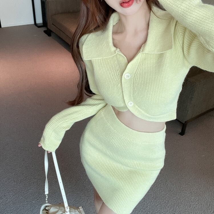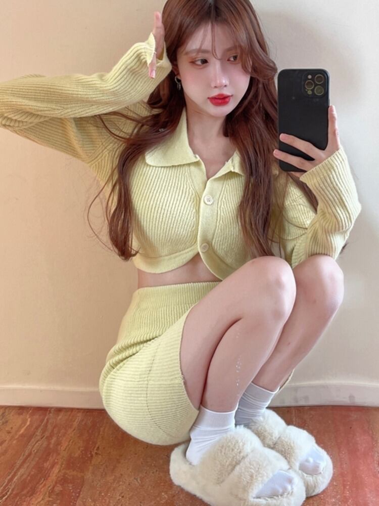 Hotsweet ニットツーピースセット女性長袖セーターカーディガンクロップトップ + ボディコンスカートセット甘い 2 ピーススーツ ロング 大人ガーリー スウィート キュート カジュアル mes78673691359