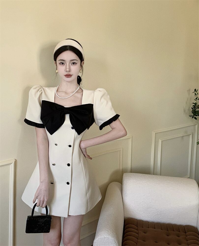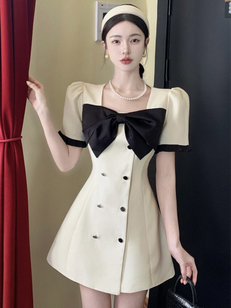 夏小さな香りの弓ミニドレス女性 OL 作業ショートドレスパーティーローブ Vestidos リボン サマー 夏物 mes13496116723