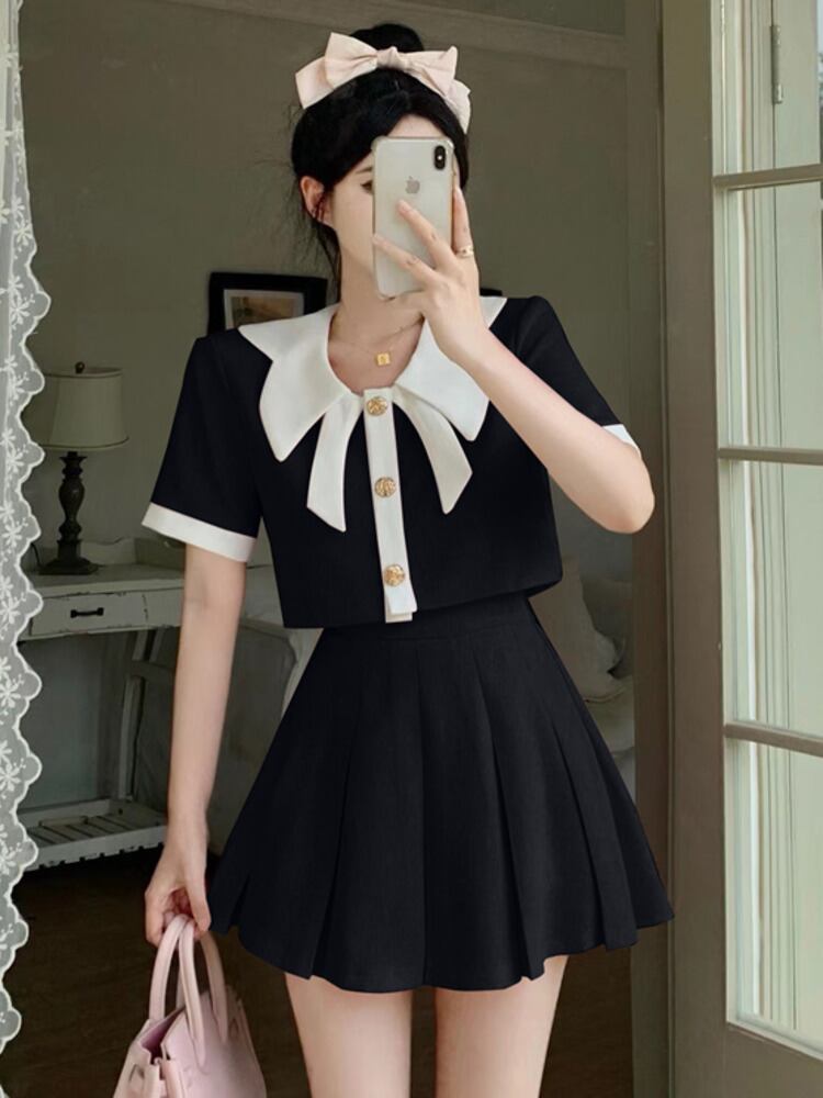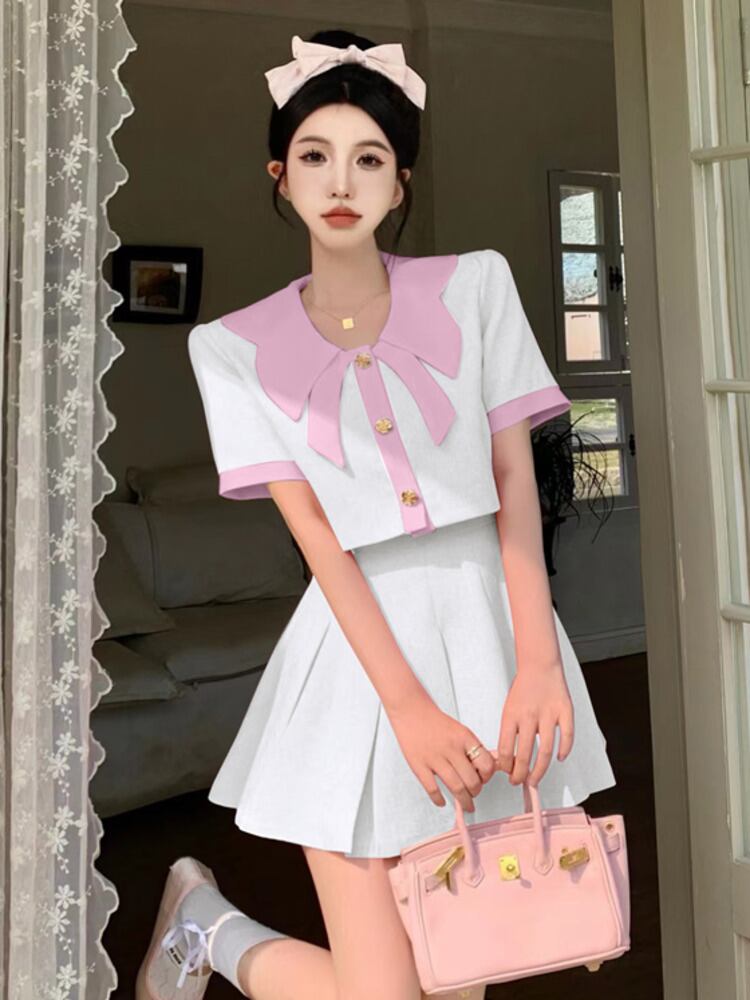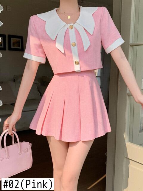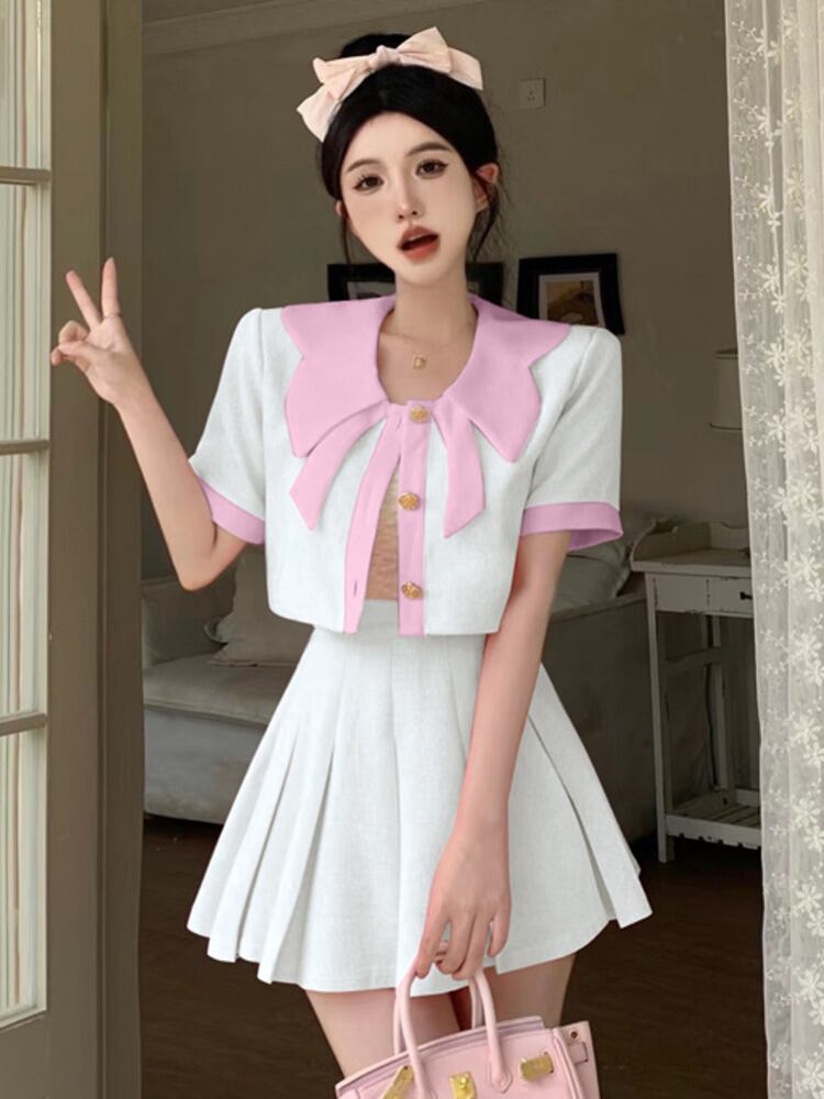 夏の甘いツーピースセット女性ショートコートクロップトップ + プリーツスカートスーツ 2 ピース衣装 大人ガーリー スウィート キュート カジュアル サマー 夏物 mes93130859481