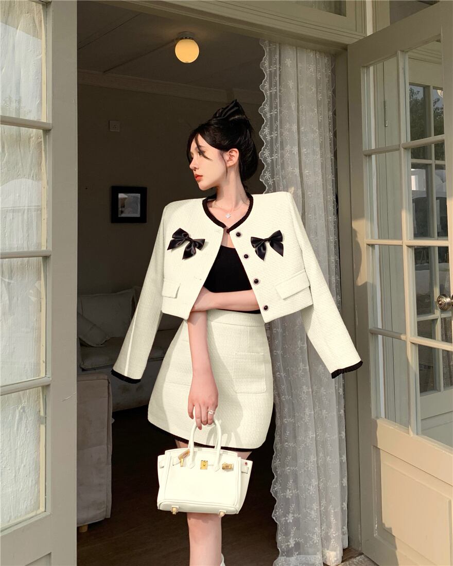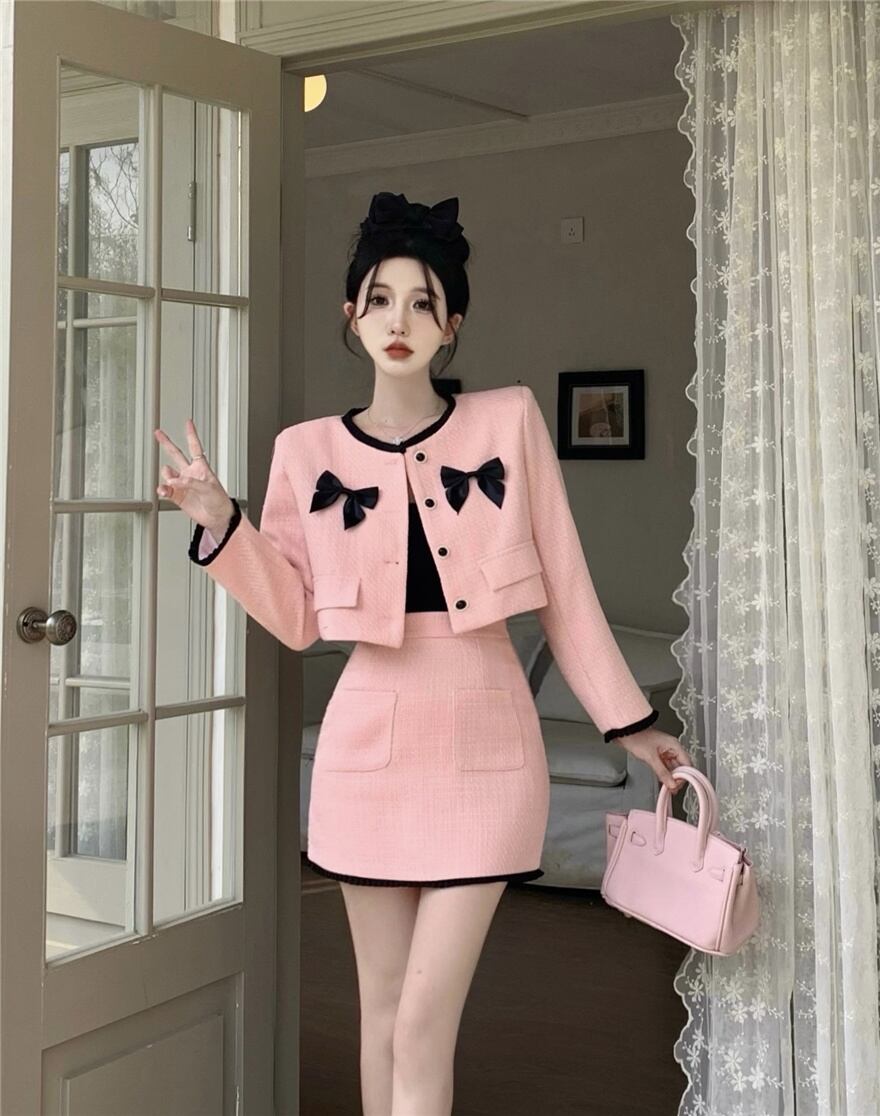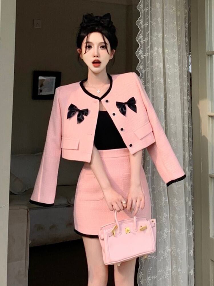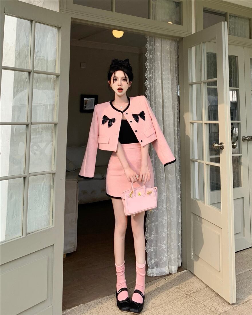 春甘いツイード 2 点セット女性かわいい弓ショート ジャケット コート クロップ トップ + ミニ スカート セット高級ツーピース スーツ リボン 大人ガーリー スウィート キュート カジュアル スプリング 春物 mes43670826762