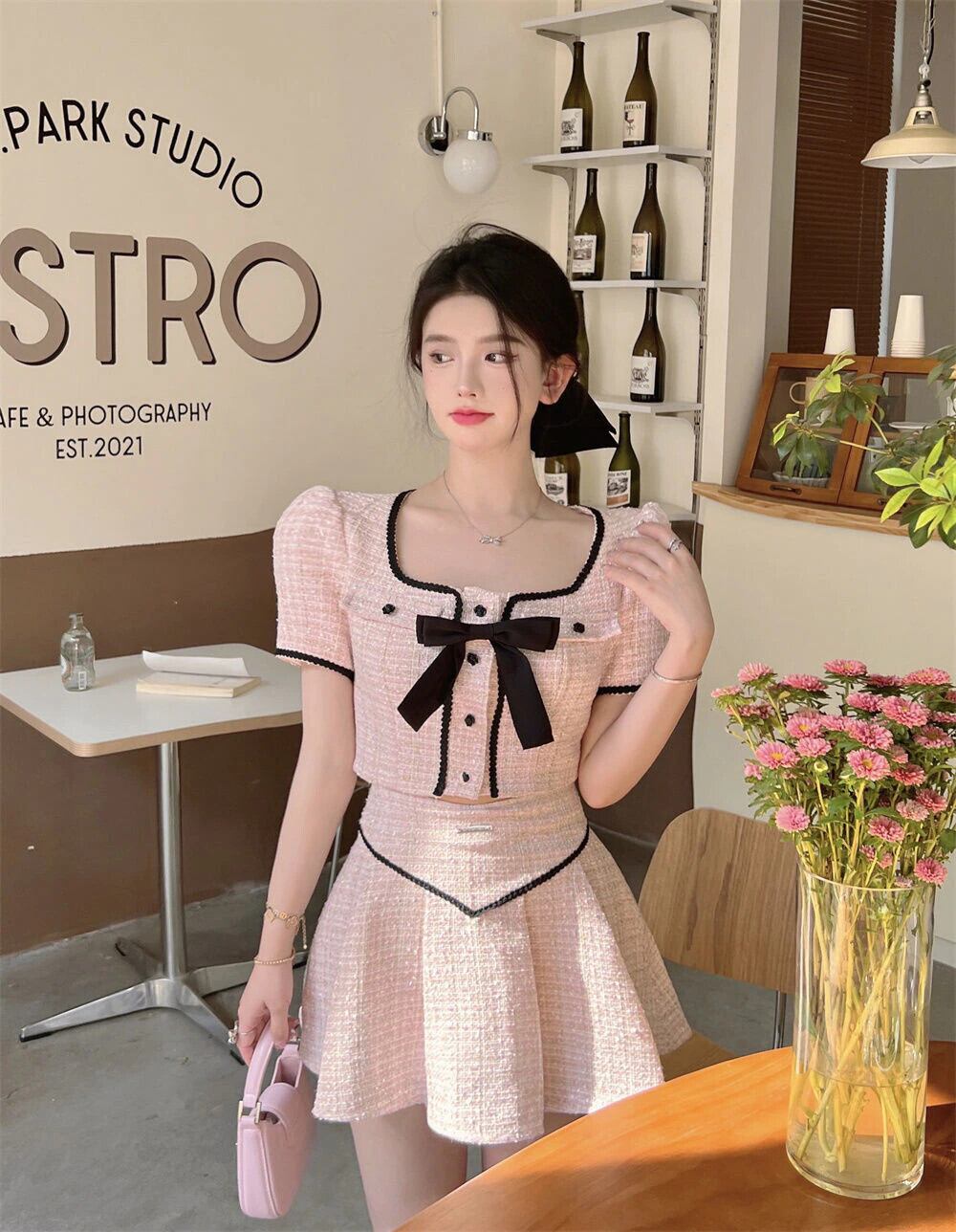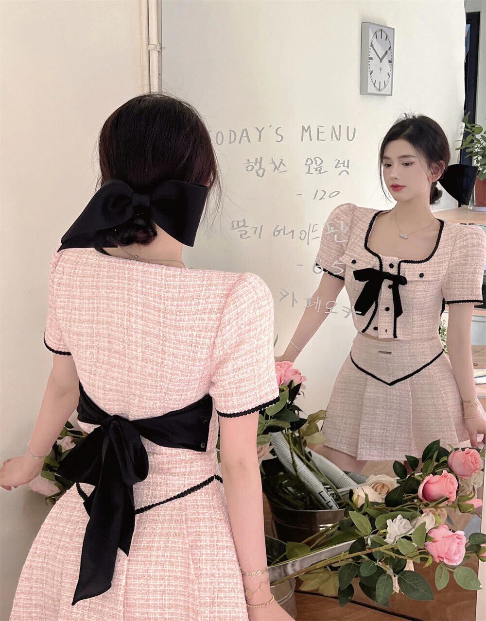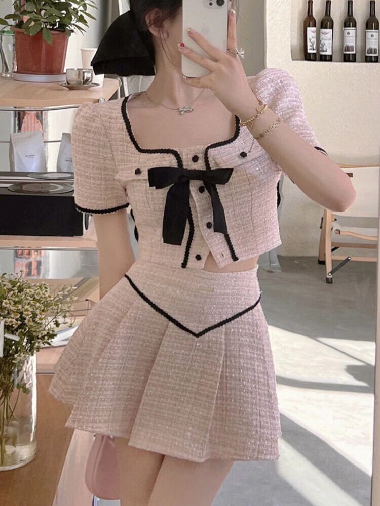 小さな香りツイード 2 点セット女性ボウ ジャケット コート クロップ トップ + スカート スーツ夏甘い 2 点セット リボン 大人ガーリー スウィート キュート カジュアル サマー 夏物 mes73519819507