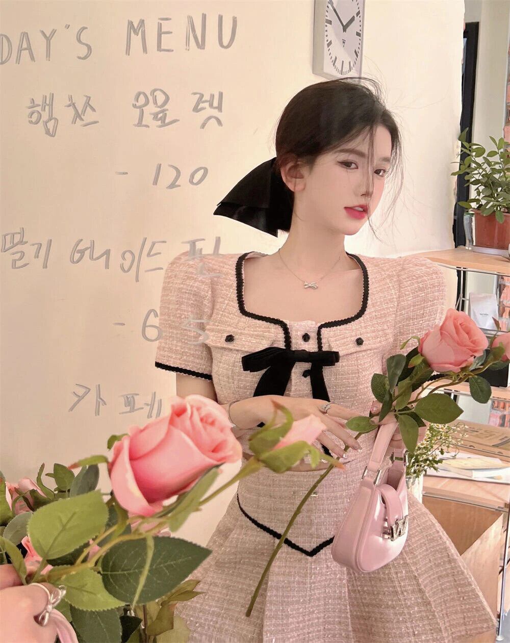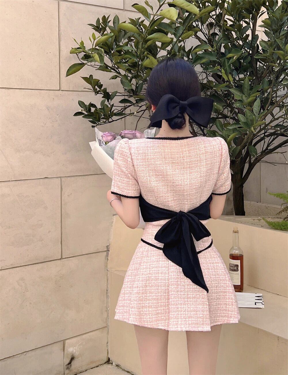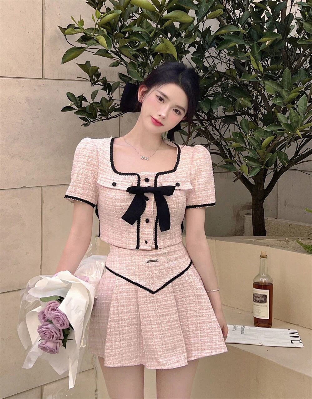 小さな香りツイード 2 点セット女性ボウ ジャケット コート クロップ トップ + スカート スーツ夏甘い 2 点セット リボン 大人ガーリー スウィート キュート カジュアル サマー 夏物 mes73519819507