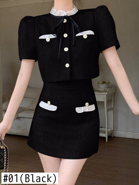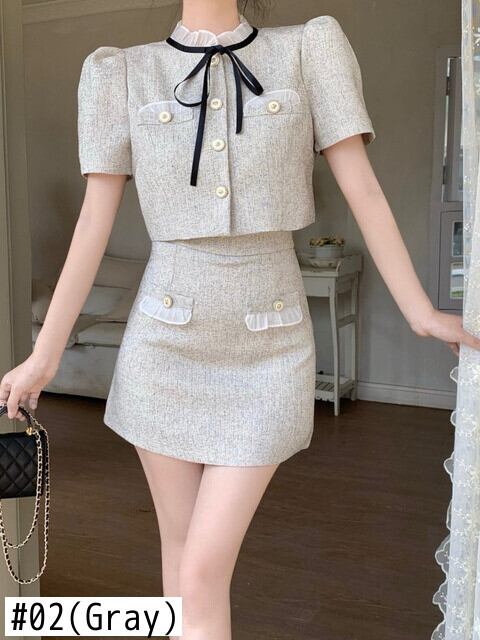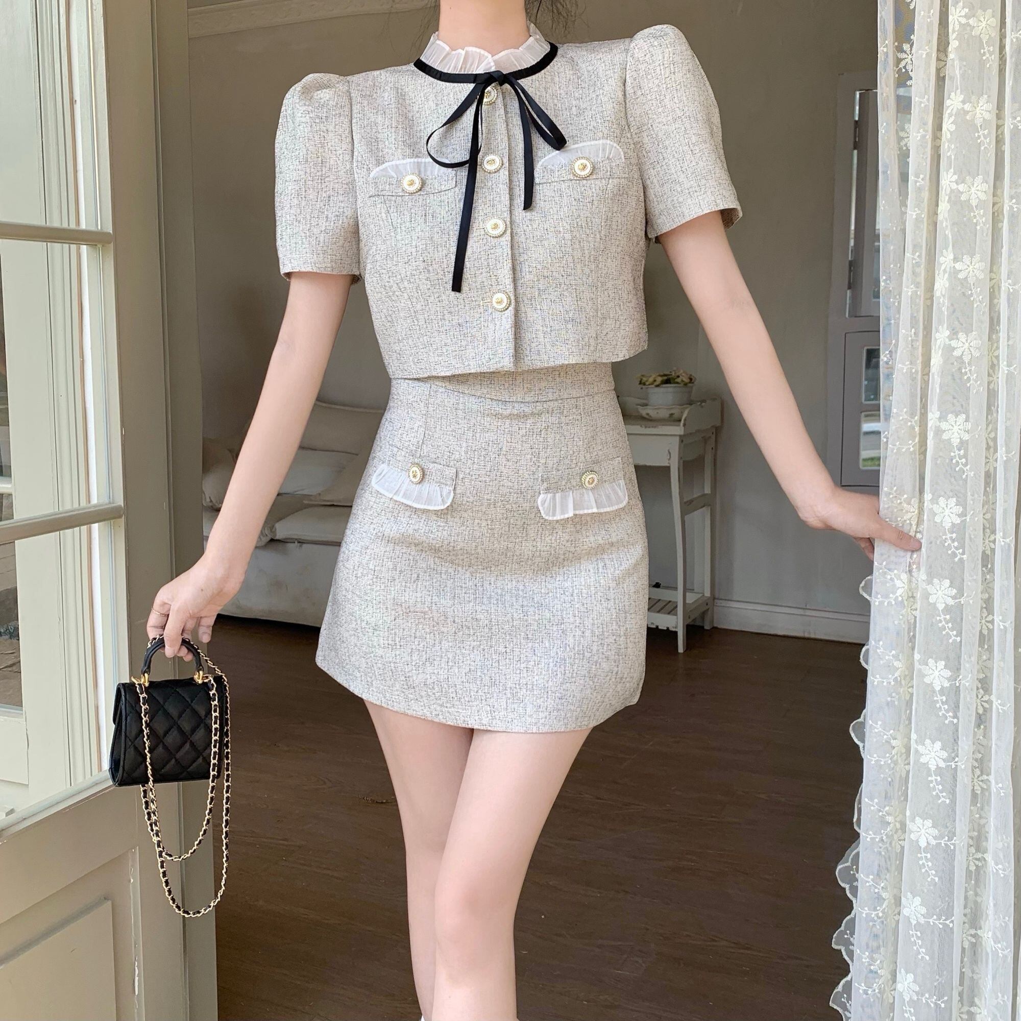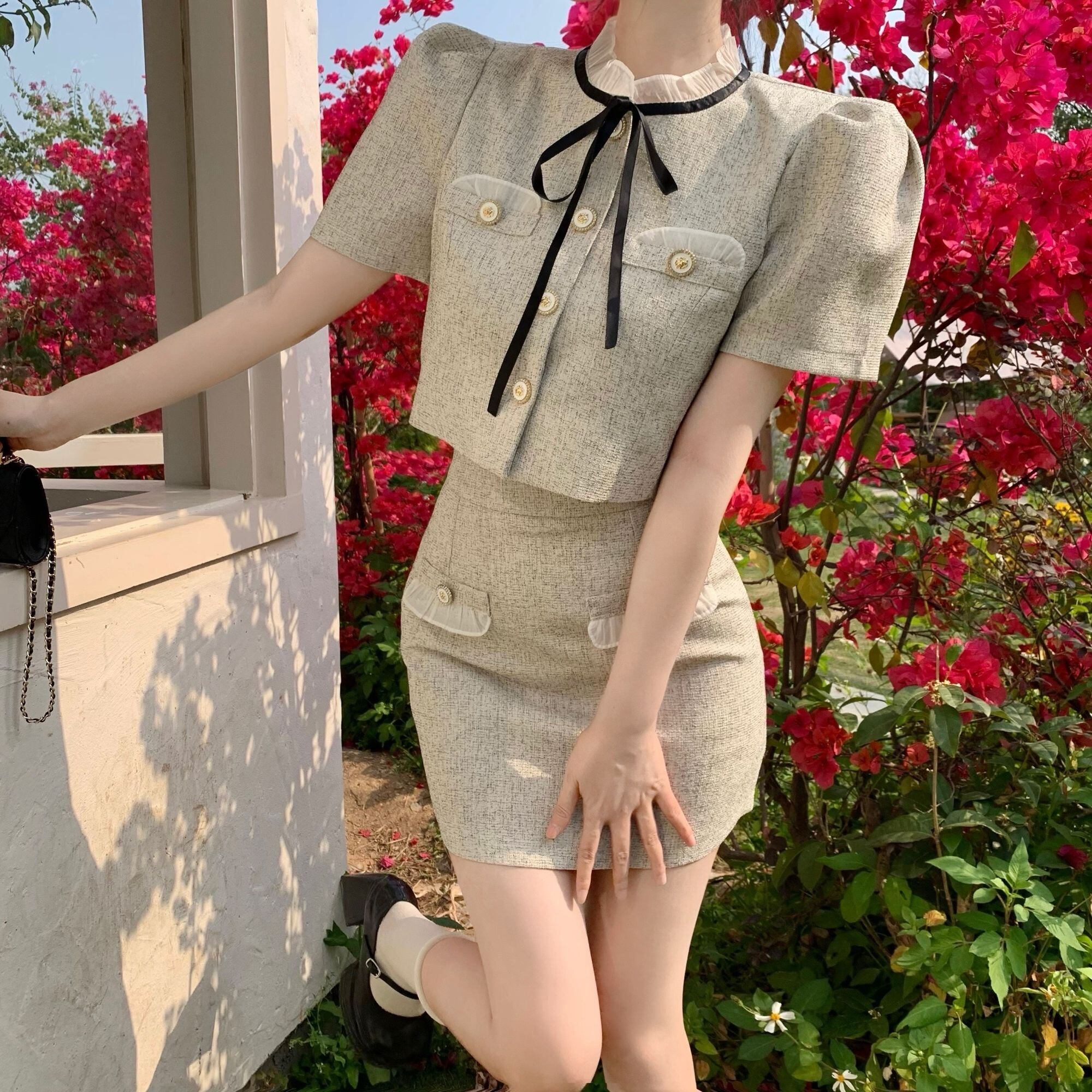 夏フレンチ小さな香りツーピースセット女性ショートコートトップス + ミニスカートスーツ 2 ピースセット サマー 夏物 mes69988308853