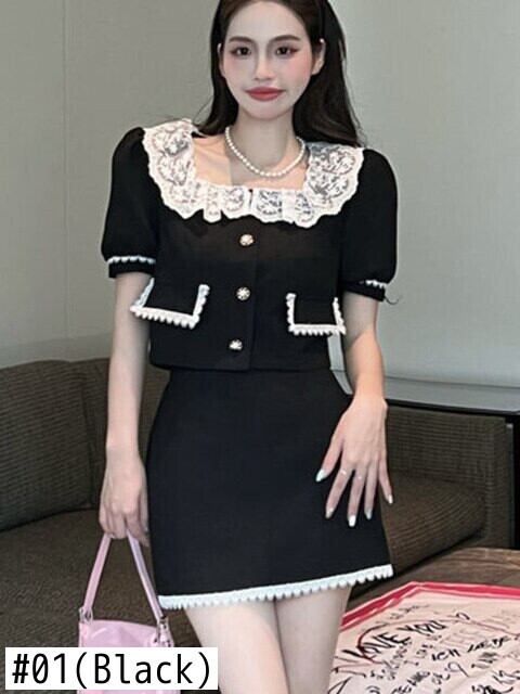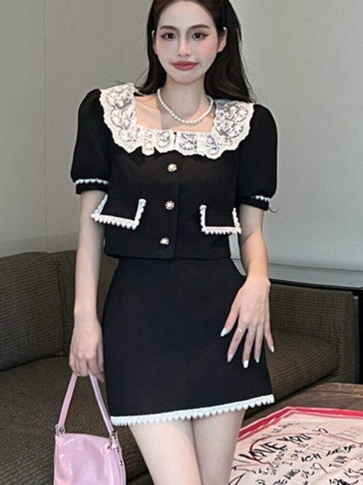 小さな香りツーピースセット女性ショートコートクロップトップ + ボディコンスカートセットストリートレーススプライシング 2 ピーススーツ mes79288794014