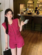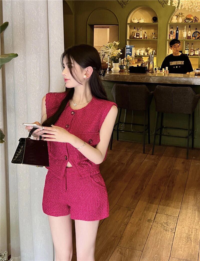 小さな香りツイード 2 点セット女性ショートベストクロップトップ & ショーツスーツ夏甘いウールのツーピースパンツセット 大人ガーリー スウィート キュート カジュアル サマー 夏物 ブルマー mes73701461710