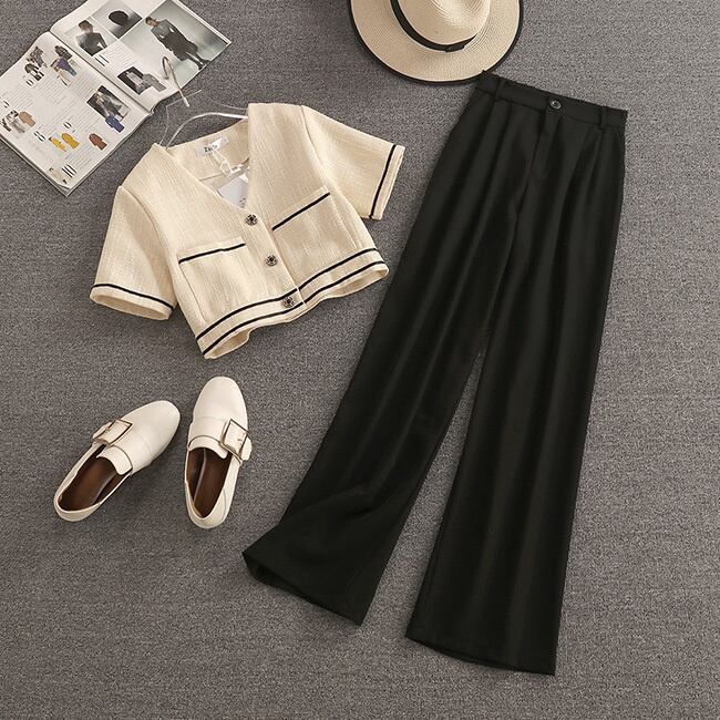 ストリート夏ツーピースセット女性クロップトップシャツブラウス + ワイド脚パンツスーツジャケットコートパンツ 2 点セット サマー 夏物 ワイドレッグ ワイドパンツ mes12149428307