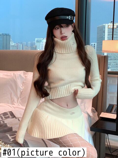 春甘いニットツーピースセット女性タートルネックプルオーバーセータークロップトップ + ミニスカート 2 ピーススーツ 大人ガーリー スウィート キュート カジュアル スプリング 春物 mes21557705493