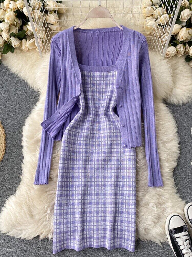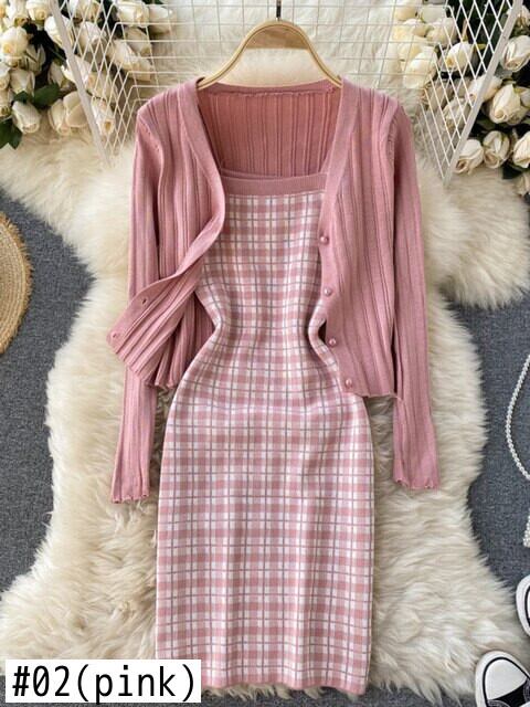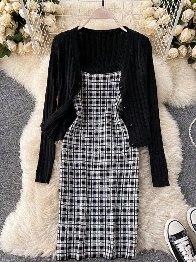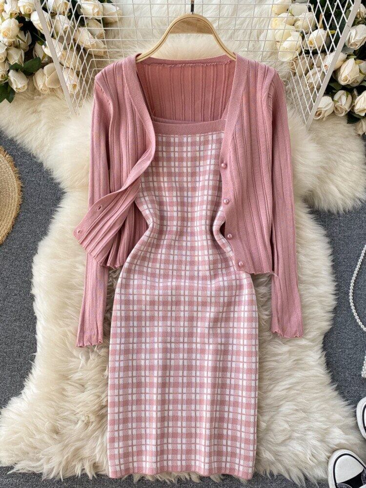 ニットツーピースセット女性クロップトップ + セクシーなスパゲッティストラップ格子縞のドレススーツ甘い長袖セーターカーディガン 2 ピーススーツ ロング 大人ガーリー スウィート キュート カジュアル mes50631160826
