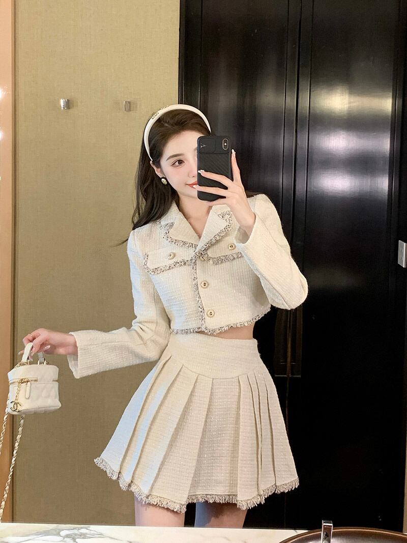 小さなフレグランス ツイード 2 点セット女性ショート ジャケット コート クロップ トップ + プリーツ スカート スーツ高級 2 点セット mes84143916723