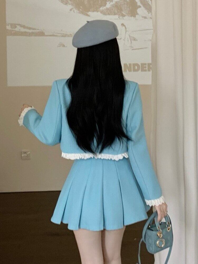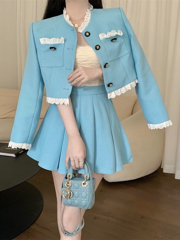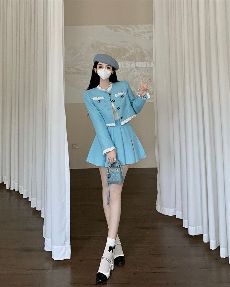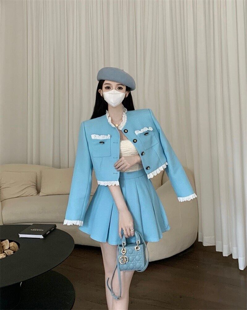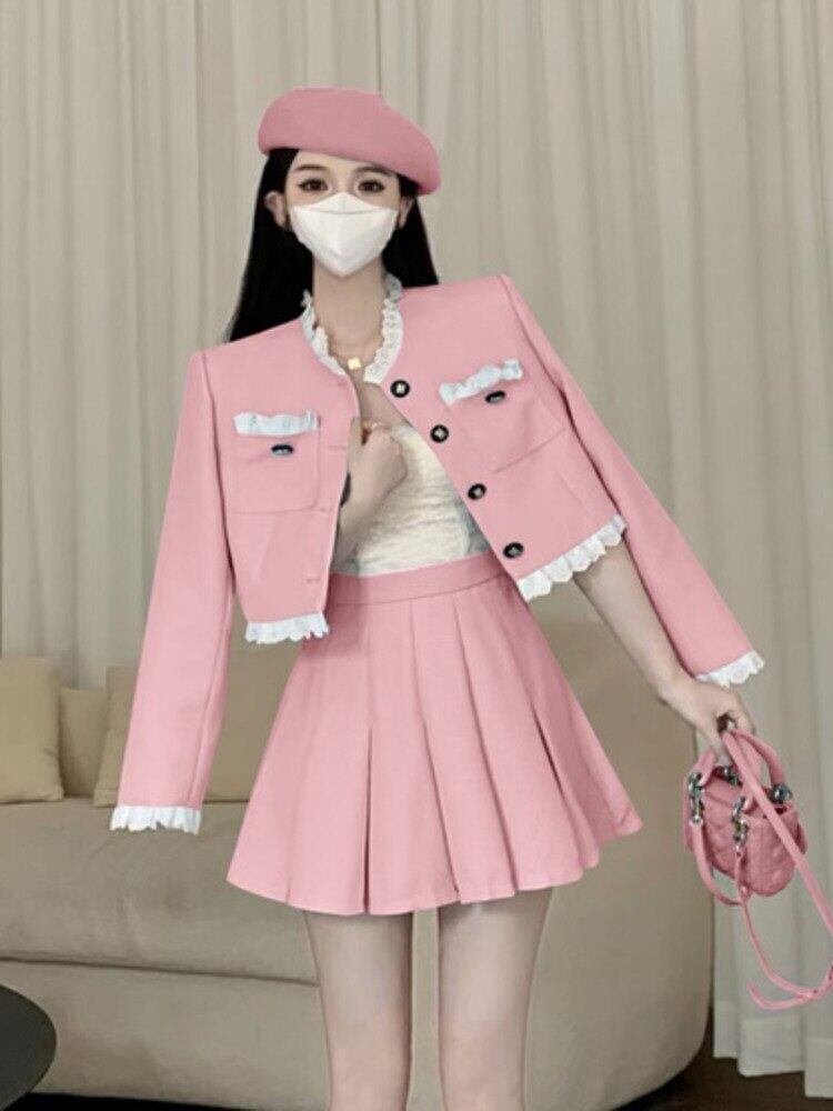 春ツーピーススカートセット女性ジャケットコートクロップトップ + プリーツスカートスーツ小さな香り 2 ピースセット女性の衣装 スプリング 春物 mes62920948451