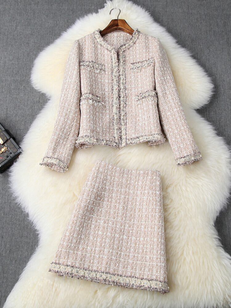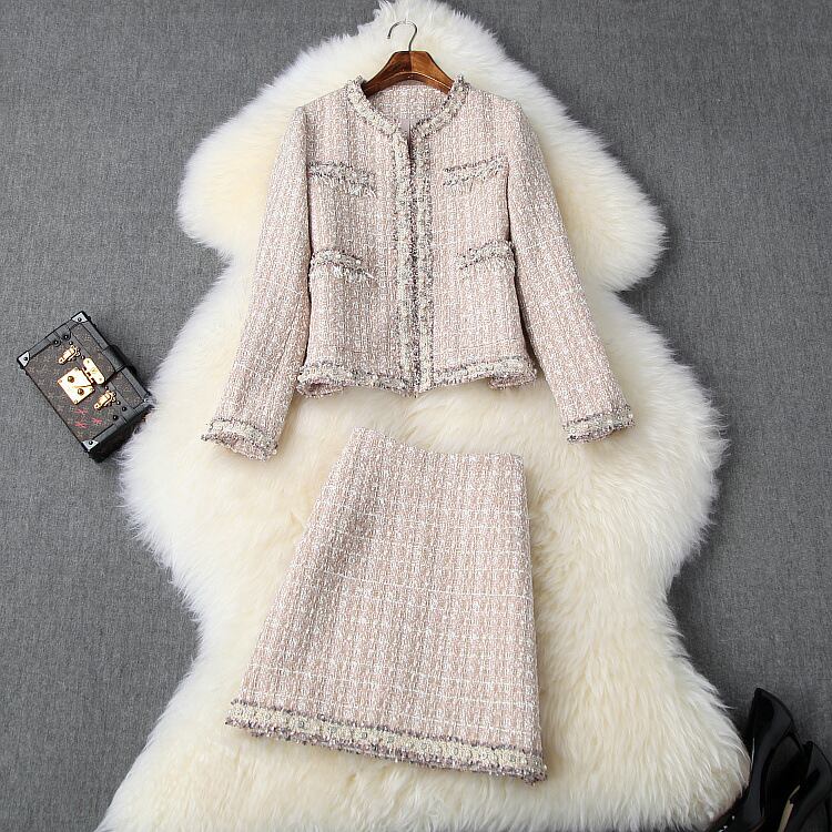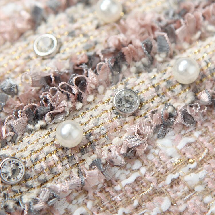 トップ滑走路 2 点セット女性秋冬高級真珠ビーズツイードウールジャケットコートとスカートスーツセット オータム 秋物 ウィンター 冬物 パール mes89830325089