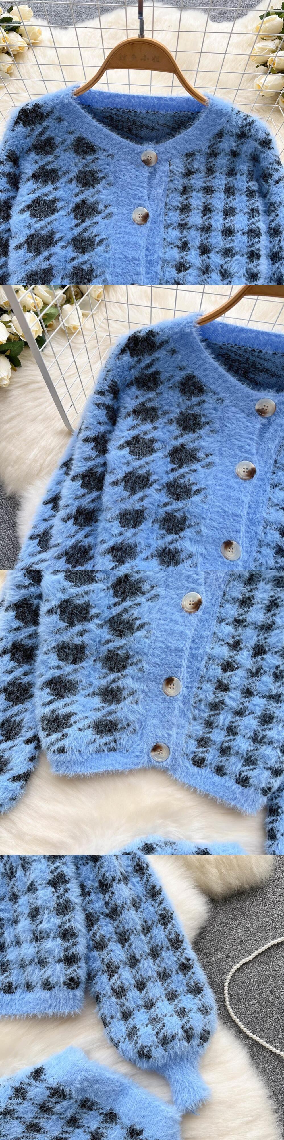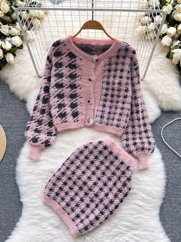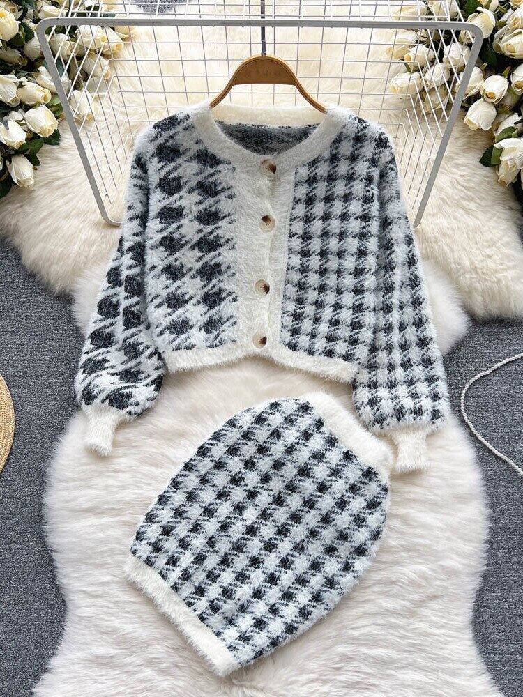 秋冬セーターツーピーススカートセット女性服甘い千鳥格子ニットカーディガンコート & スカートスーツ 2 点セット 大人ガーリー スウィート キュート カジュアル ウィンター 冬物 mes41010459084
