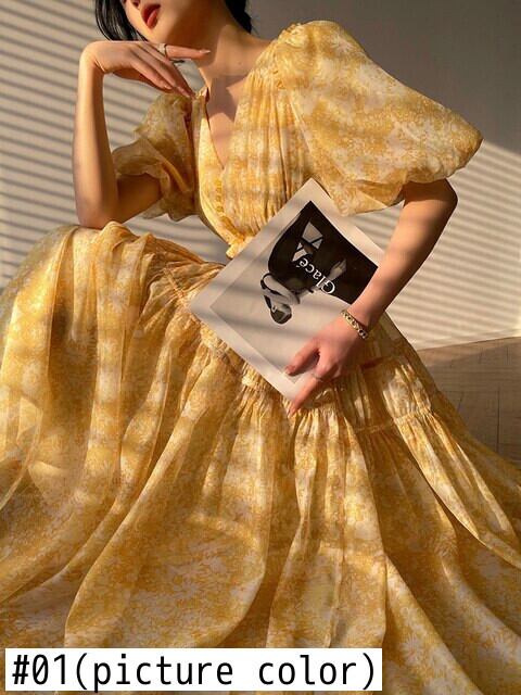 フレンチプリントミディドレス女性長袖スリムウエスト自由奔放に生きるビーチホリデードレス春夏ローブ ロング スプリング 春物 サマー 夏物 mes48173333004