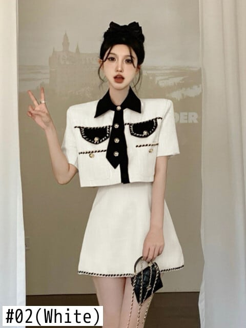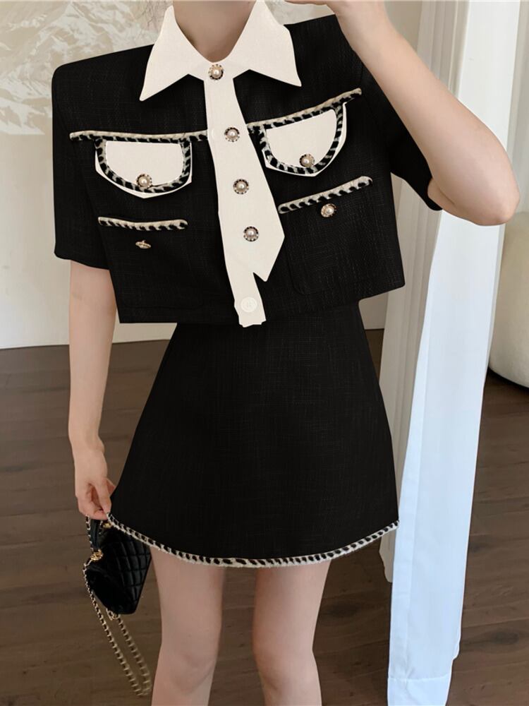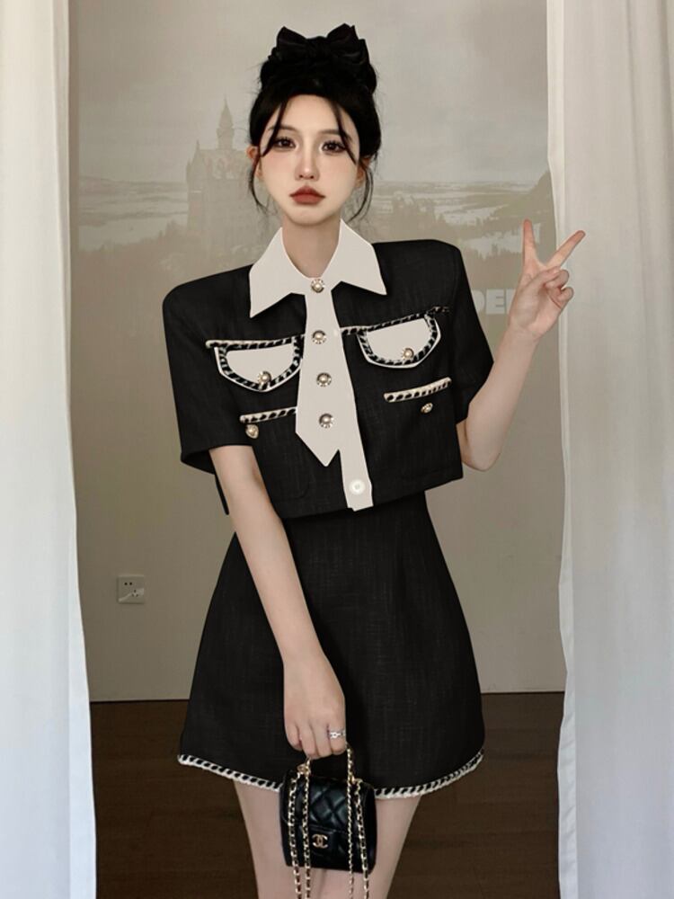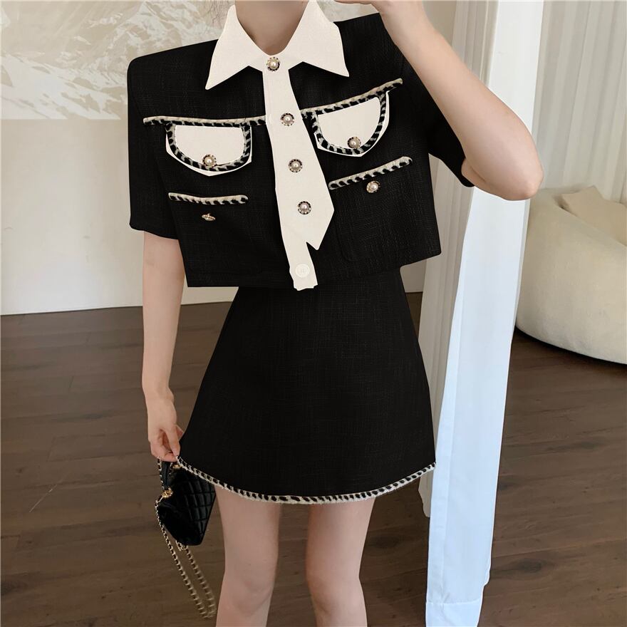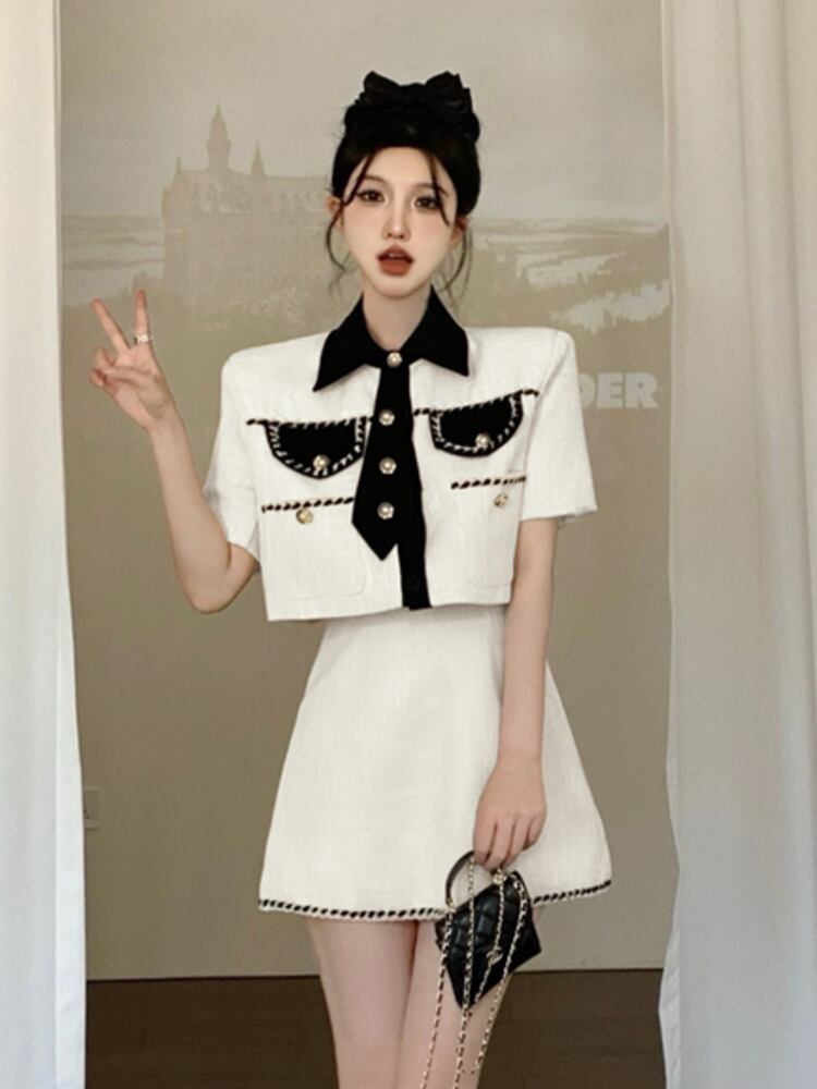 夏フレンチツーピースセット女性のシックなシャツクロップトップ & ミニスカートスーツ 2 ピース衣装 サマー 夏物 mes777523874