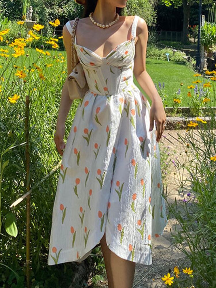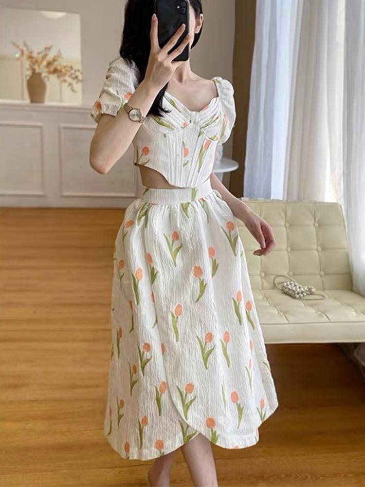 フレンチツーピースセット女性のセクシーなクロップトップ + 不規則なスカートスーツ夏チューリッププリント 2 ピーススーツ サマー 夏物 mes11394243466