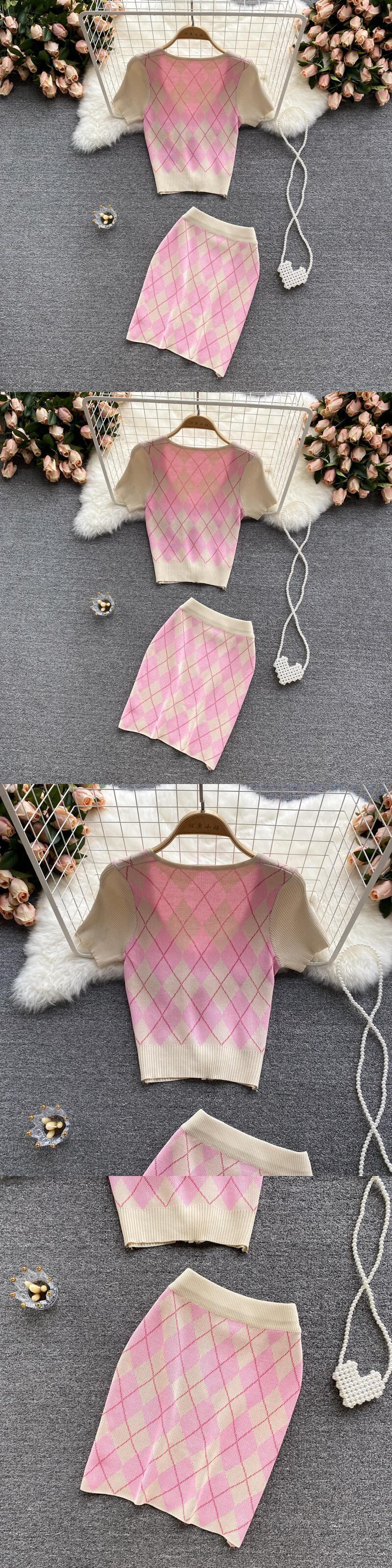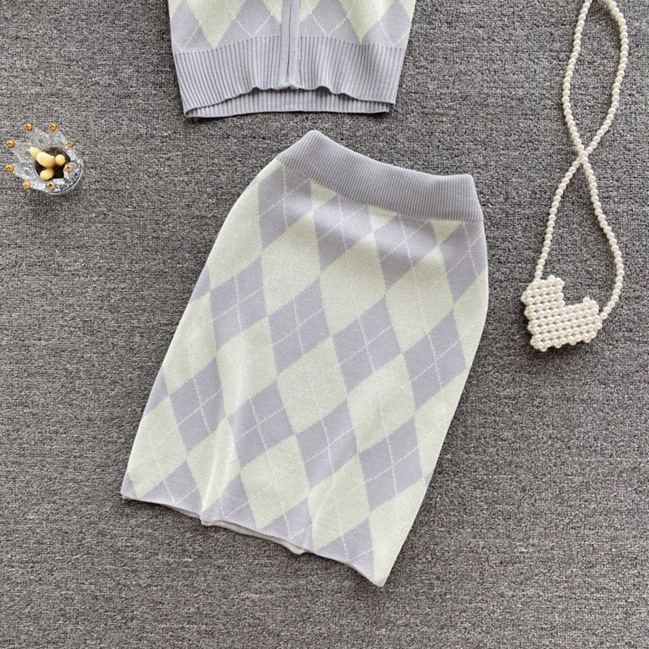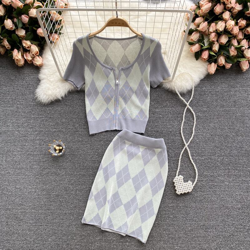 夏チェック柄ニット 2 点セット女性ジッパークロップトップ + スカートスーツトラックスーツ女性ツーピーススーツ サマー 夏物 mes72320401692