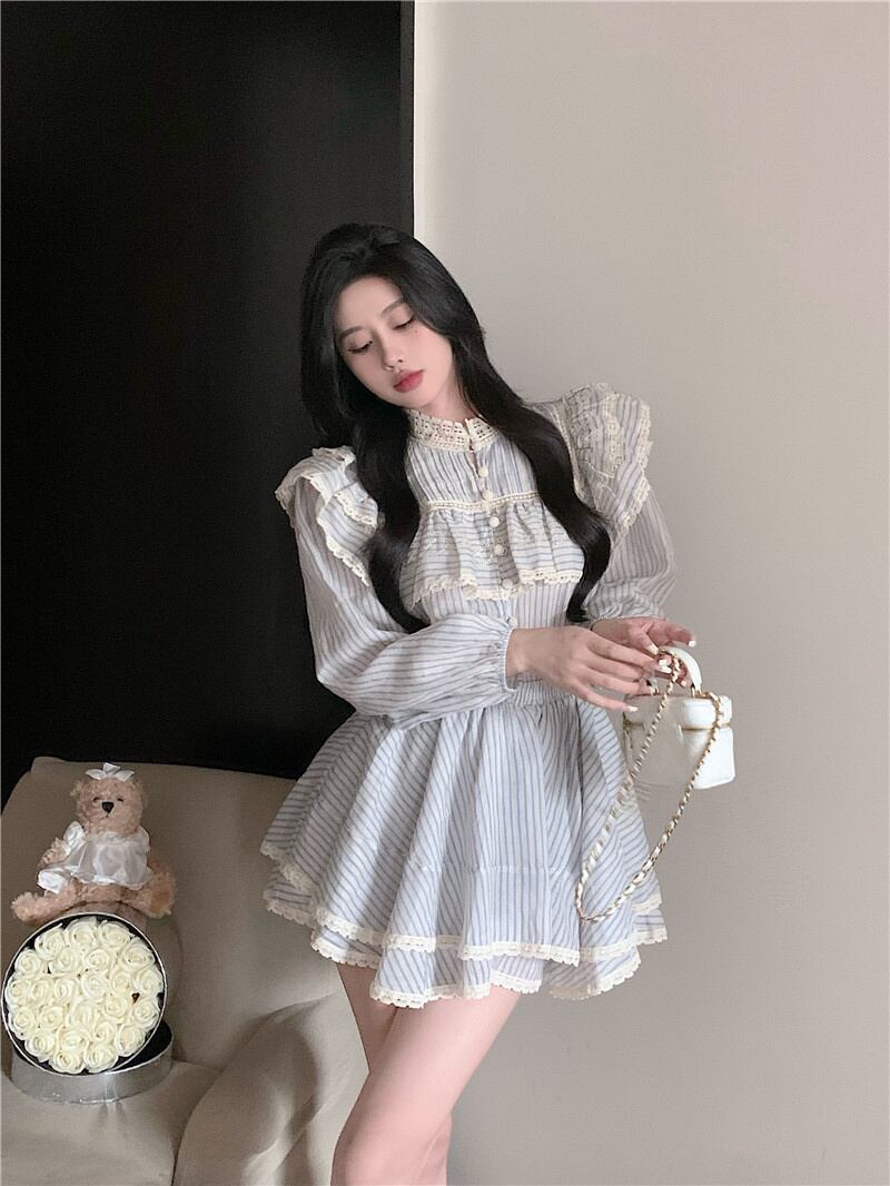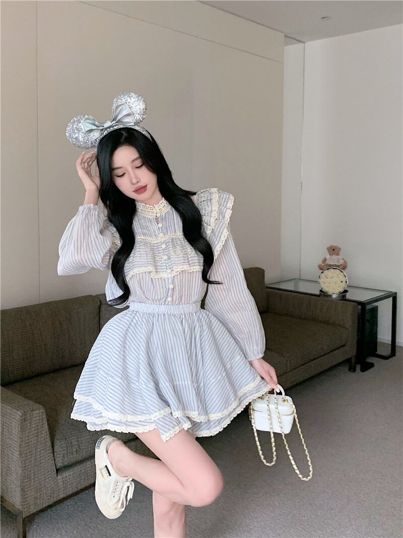 甘い小さな香りの 2 点セット女性ストライプ シャツ ブラウス + ミニ スカート セット スカート ツー ピース スーツ 大人ガーリー スウィート キュート カジュアル mes82861061948