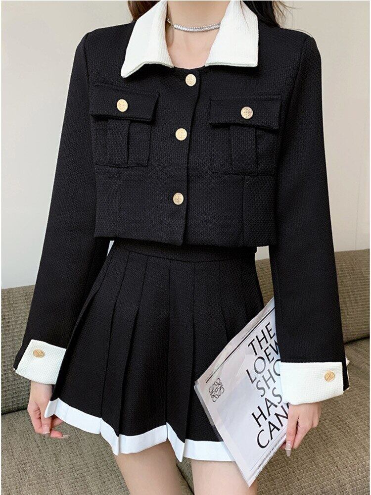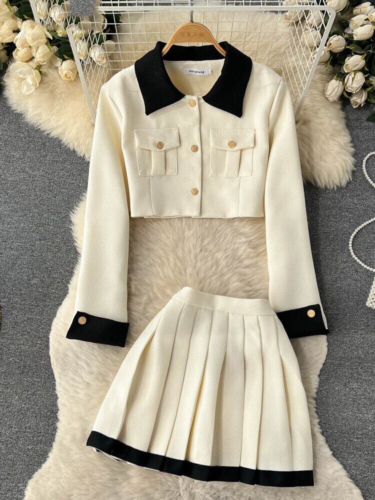 秋アンサンブル ファム 2 点セット女性衣装ショート ジャケット コート + プリーツ スカート conjuntos デ ファルダ フェミニン mes18839702164