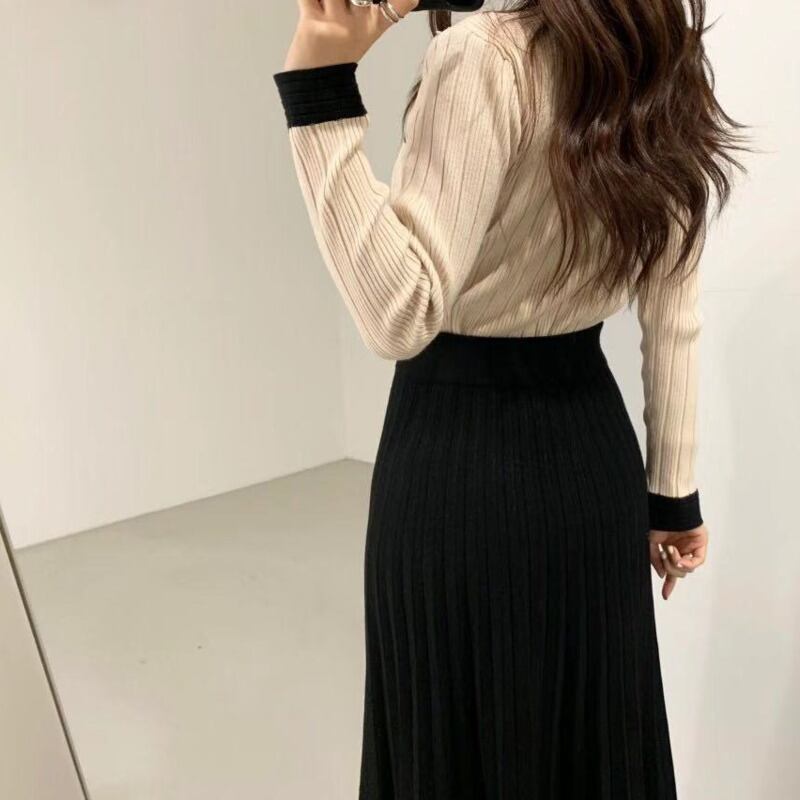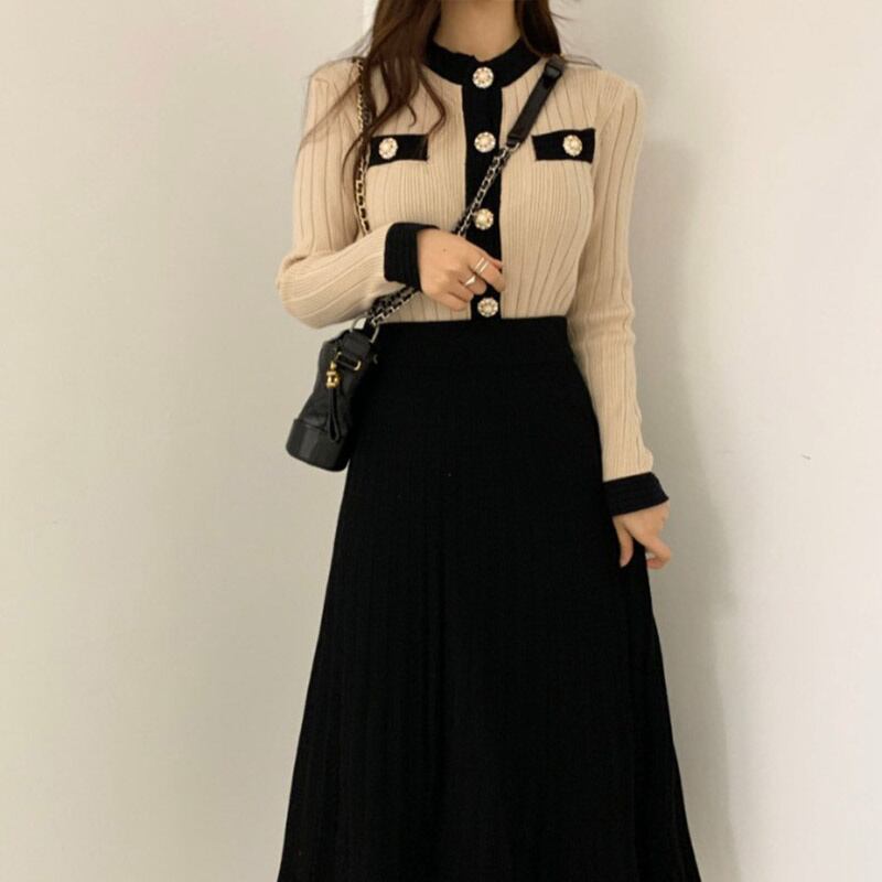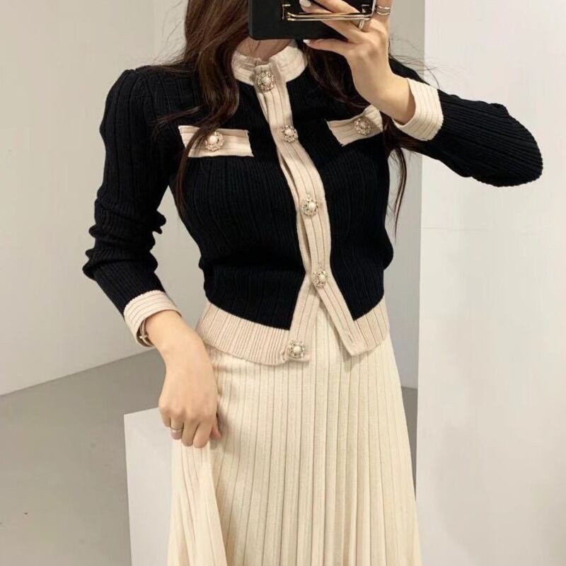 シックなニット 2 点セット女性クロップ トップ パール ボタン セーター カーディガン + プリーツ ロング スカート スーツ 2 点セット 真珠 mes7751607511
