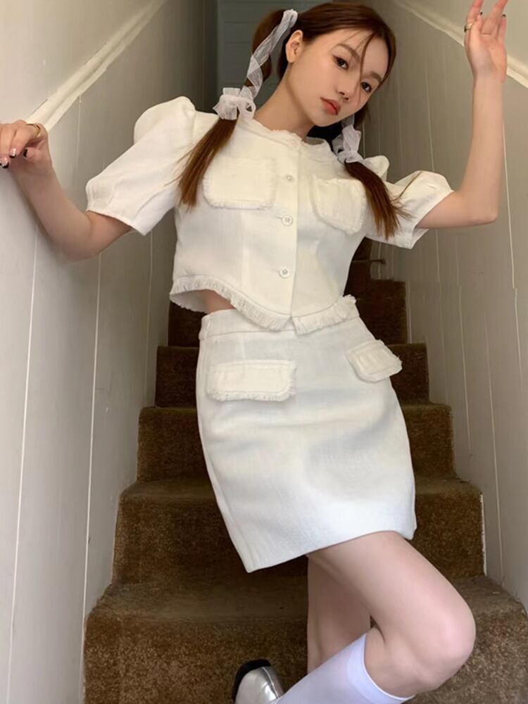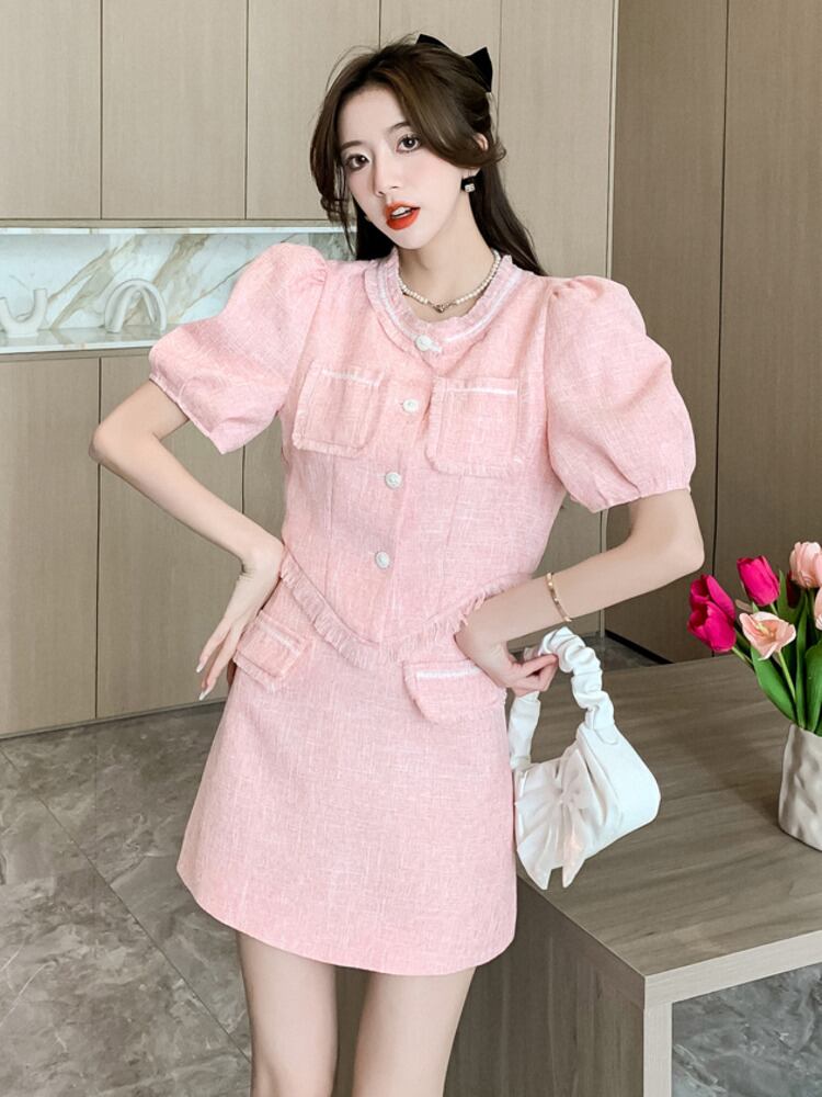 小さな香り甘いツーピースセット女性 Tels シャツブラウスクロップトップ + ウエストスカートスーツ 2 点セット 大人ガーリー スウィート キュート カジュアル mes61616860943