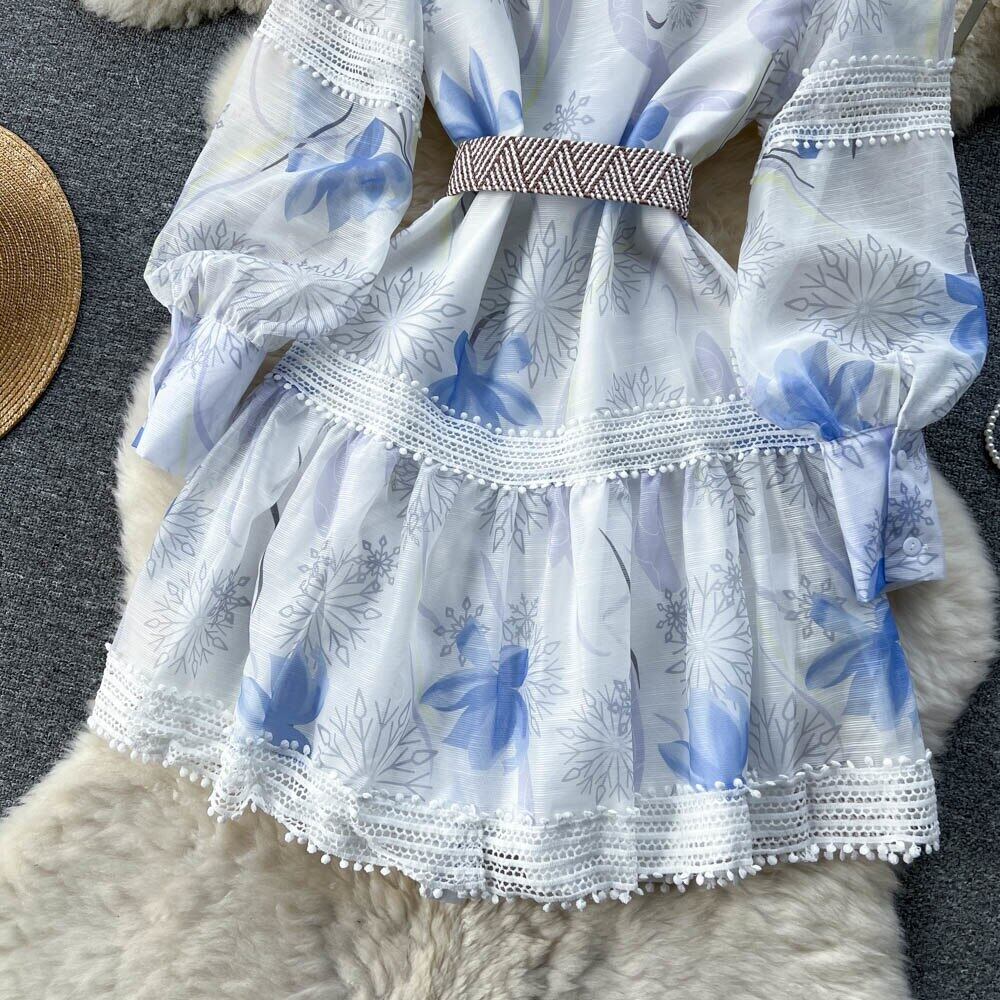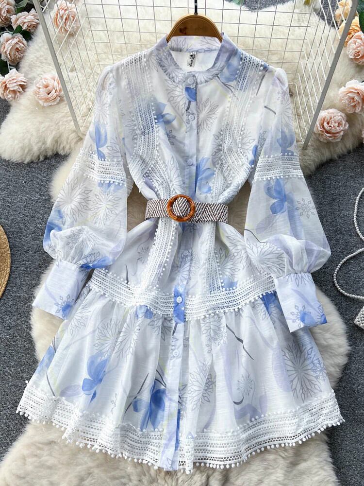 女性シングルブレストランタンスリーブ花柄ベルト Vestidos 春レース中空アウトステッチドレス スプリング 春物 ハーネス mes27880208336