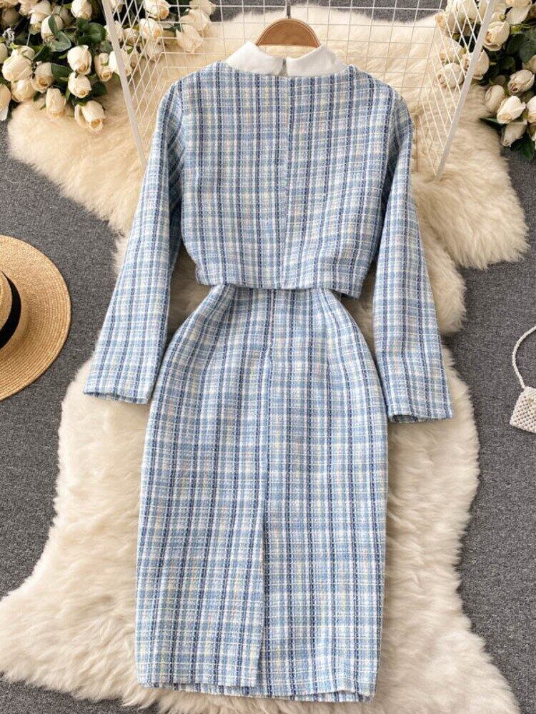 秋ドレスセットOLツイードツーピースセット女性クロップトップショートジャケットコート+パッチワークビーズドレススーツ オータム 秋物 mes17971914636