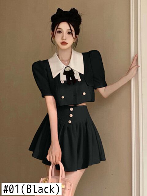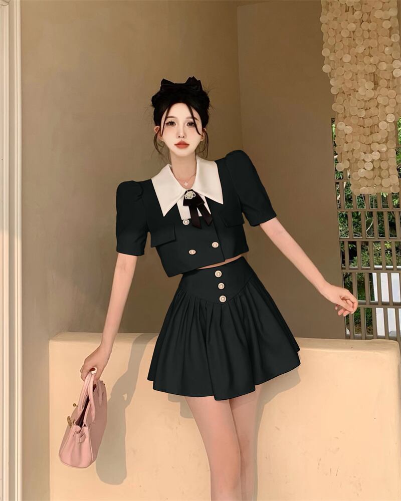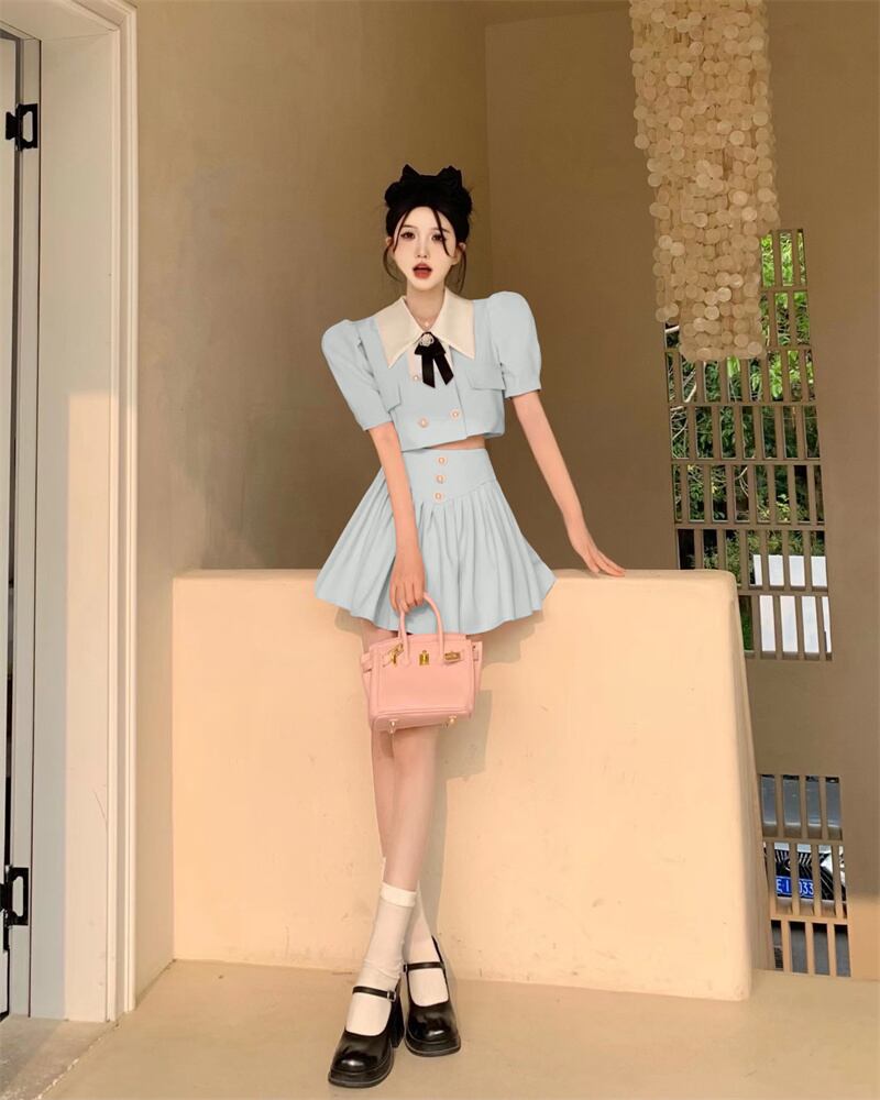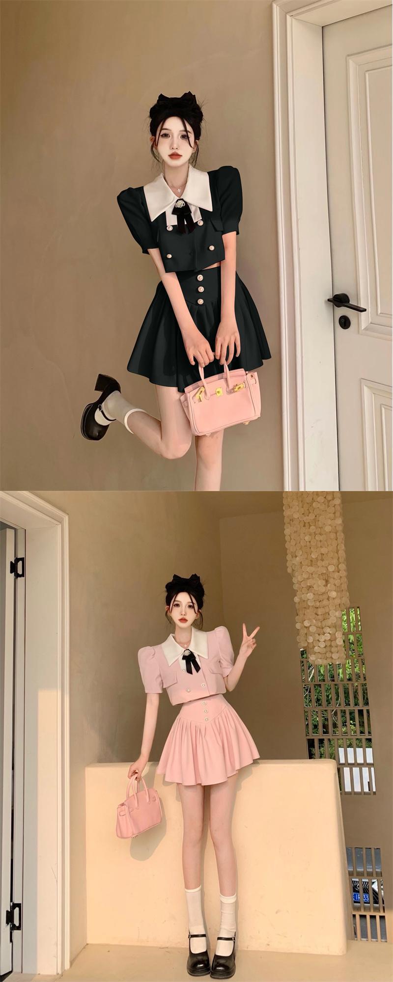 小さなフレグランススカートスーツ夏甘い 2 点セット女性弓シャツミニスカートセットツーピース衣装 リボン 大人ガーリー スウィート キュート カジュアル サマー 夏物 mes56990340098