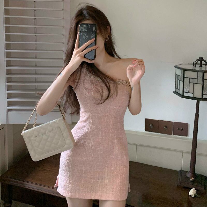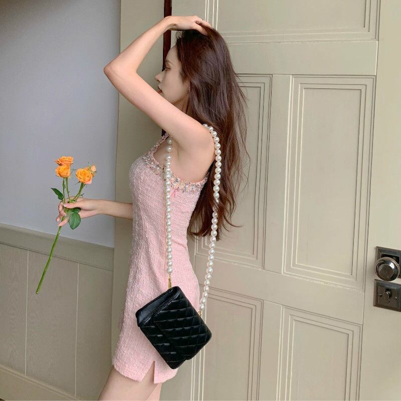 フレンチスモールフレグランスツイードドレス女性スウィートピンクビーズサマードレスノースリーブのセクシーなドレス 大人ガーリー キュート カジュアル 夏物 mes77587740422