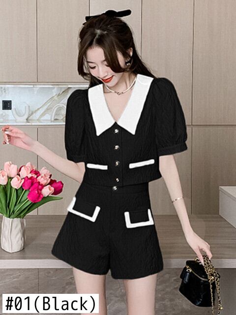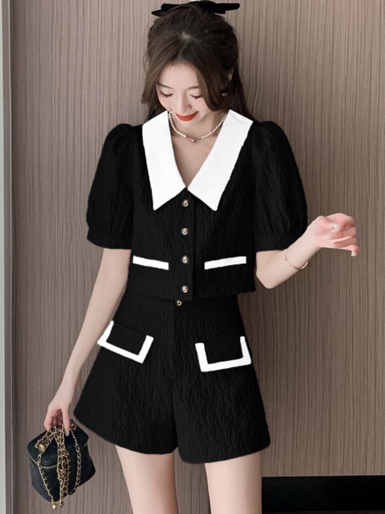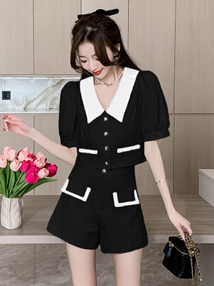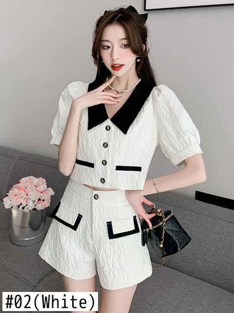 小さな香りのジャカード 2 点セット女性クロップトップ + ショートセット夏の服装の女性ストリートツーピースパンツセット サマー 夏物 mes92218295113