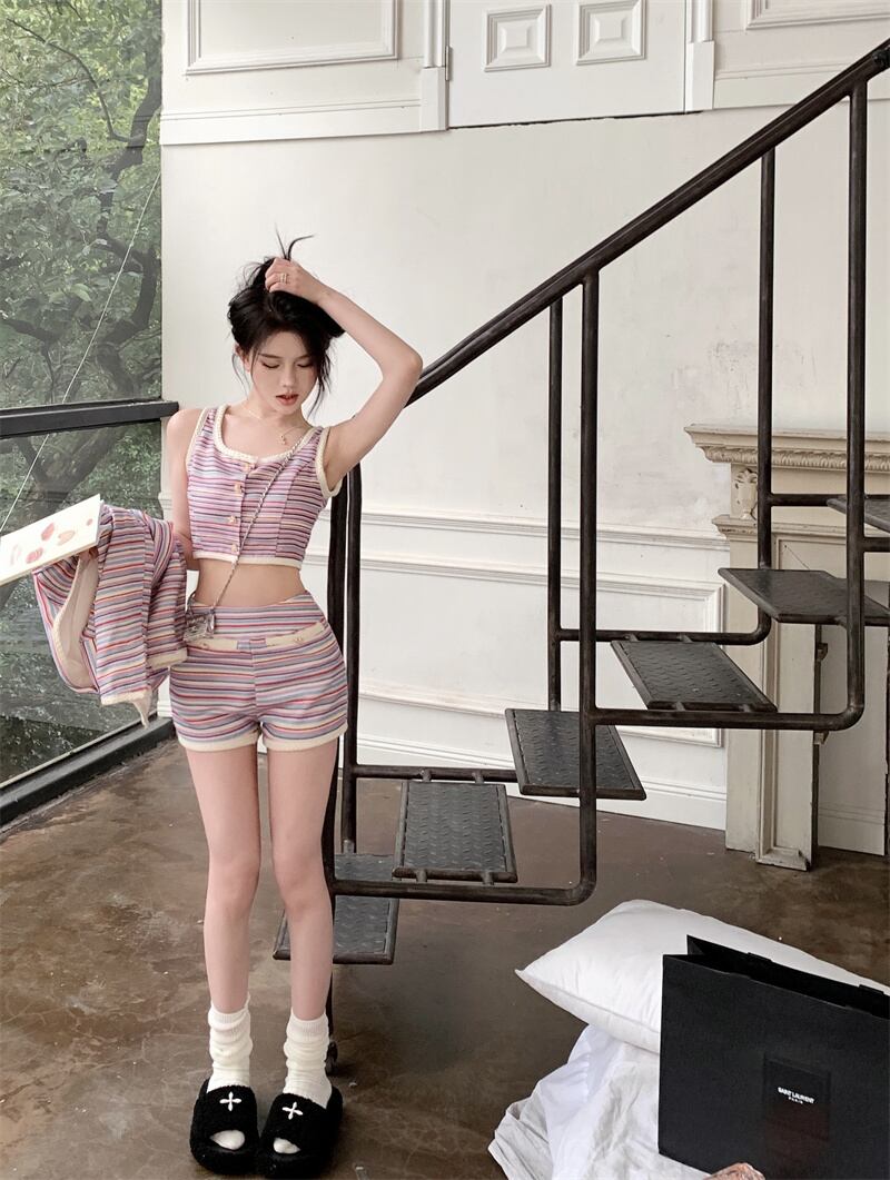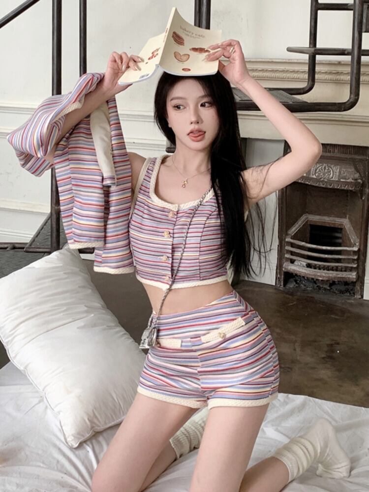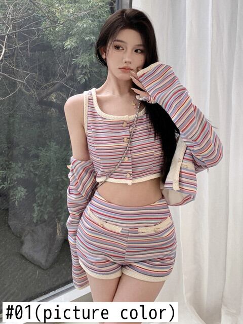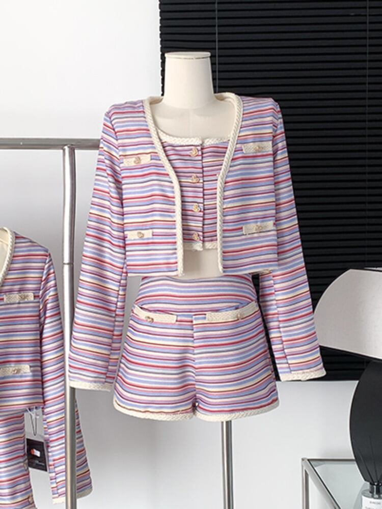 春の小さなフレグランス ストライプ 3 点セット女性ショート ジャケット コート + ベスト + ショート セット ストリート 3 ピース パンツ セット スプリング 春物 mes12343807327