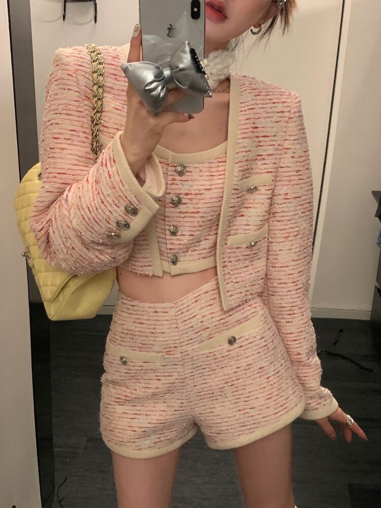 ストリートスモールフレグランススリーピーススーツ女性ショートジャケットコート + ベスト + ショートセット春 3 ピースパンツセット スプリング 春物 mes84610308737