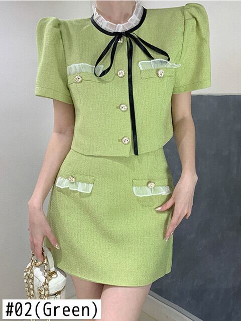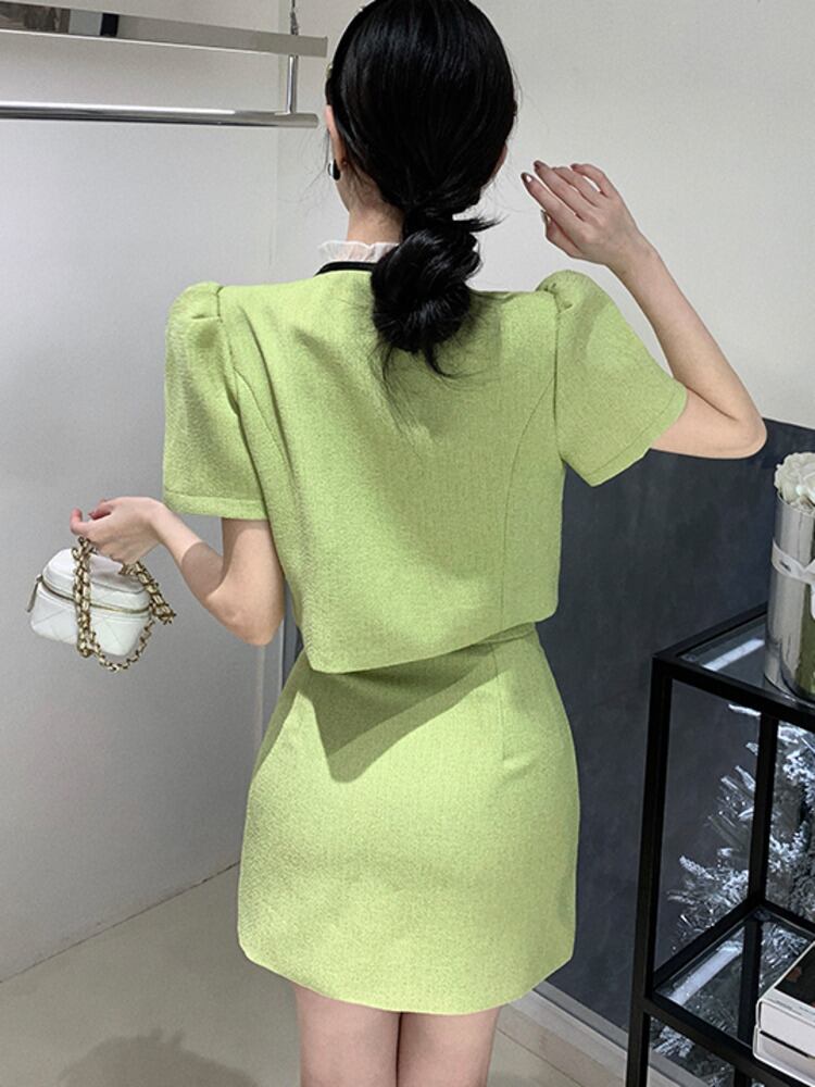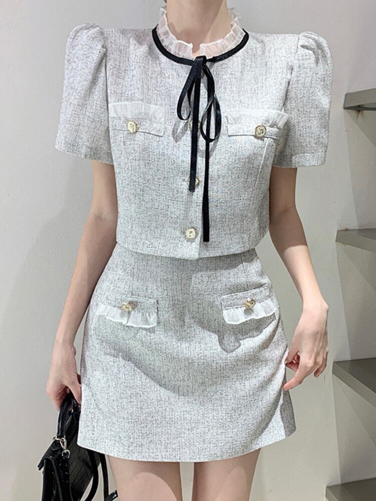 小さなフレグランスツーピースセットパフスリーブシャツクロップトップ + ミニスカートセットストリート夏 2 ピーススーツ サマー 夏物