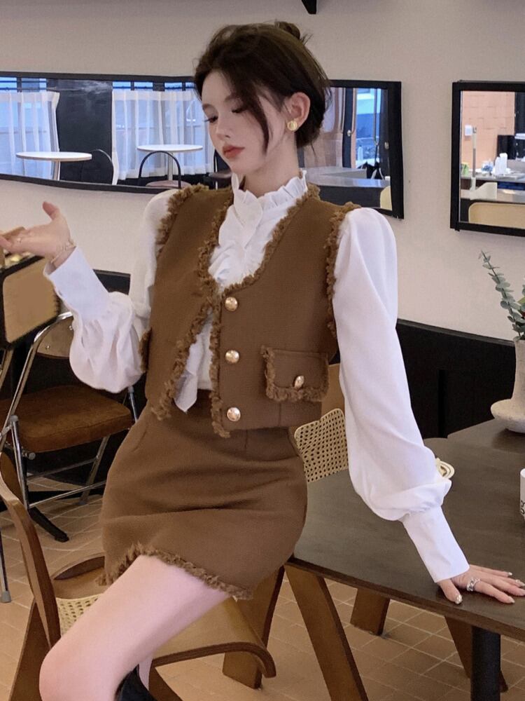 ストリートスモールフレグランス3点セットベスト+シャツ+スカートセットフレンチスリーピーススーツ
