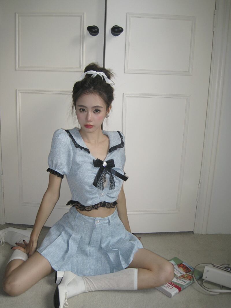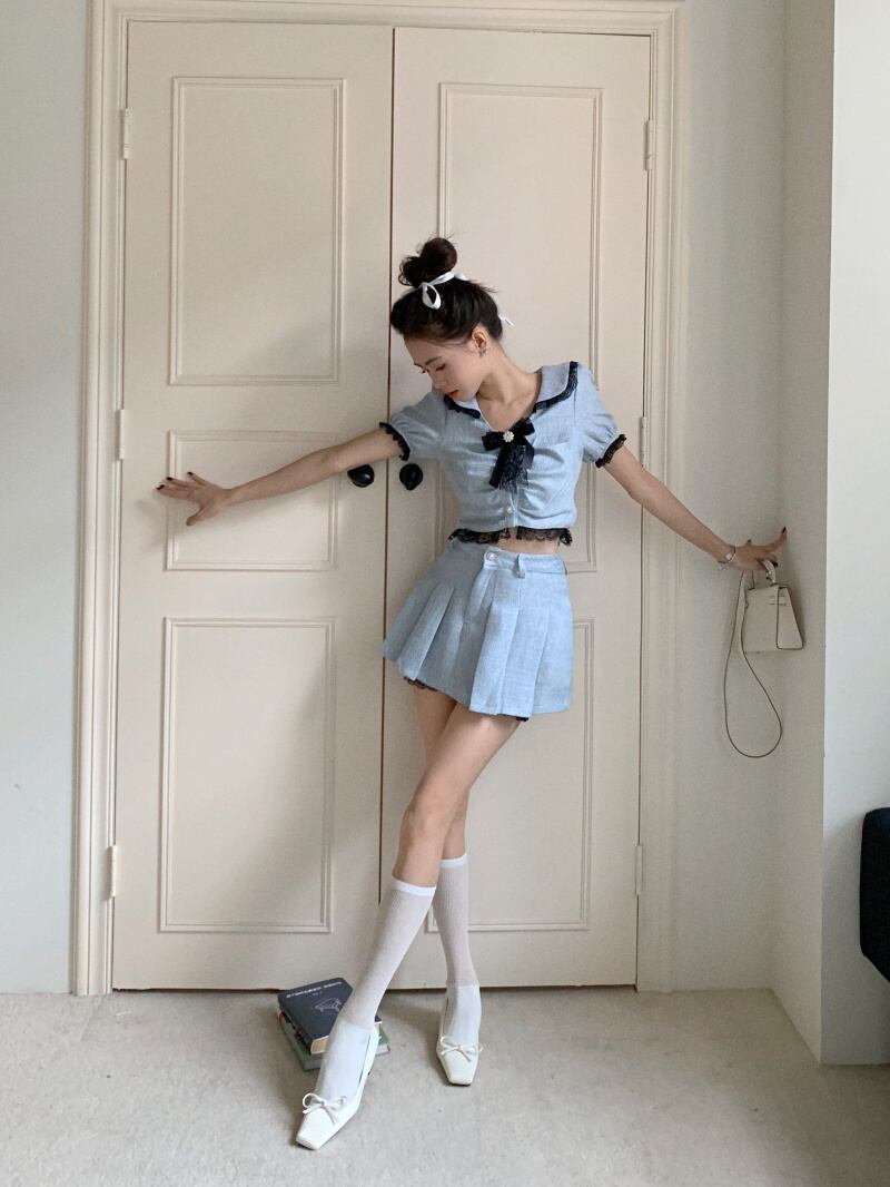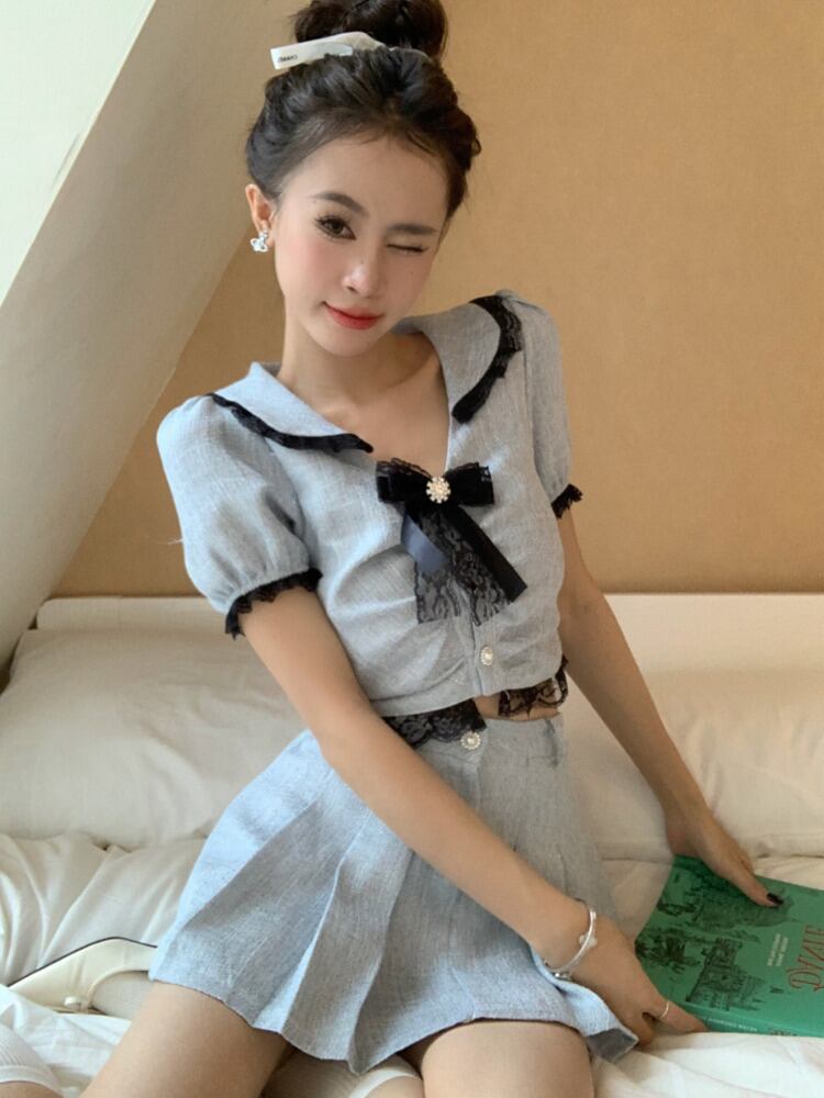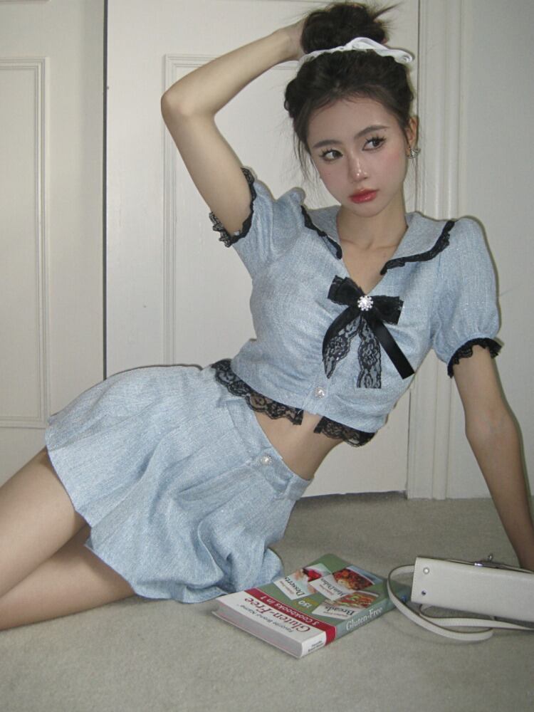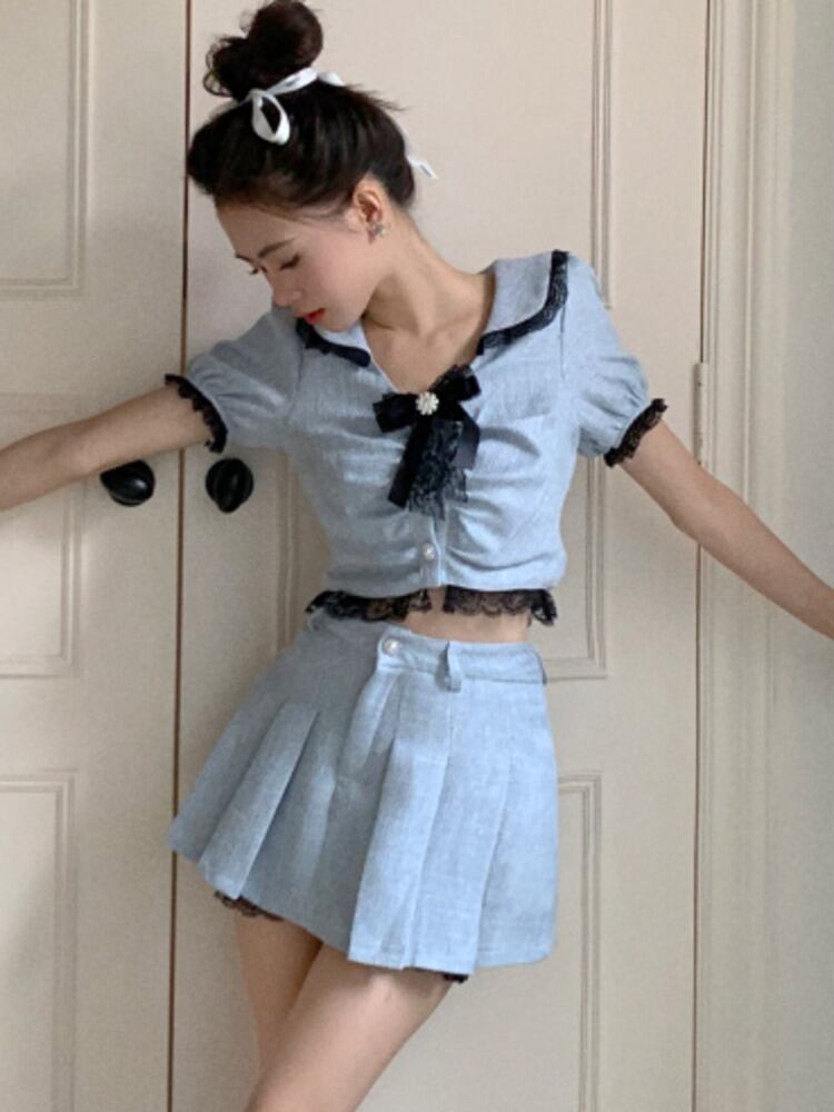 フレンチスモールフレグランススーツクロップトップ + プリーツスカートセット夏の女の子スウィートレースパッチワークツーピースセット 大人ガーリー キュート カジュアル サマー 夏物