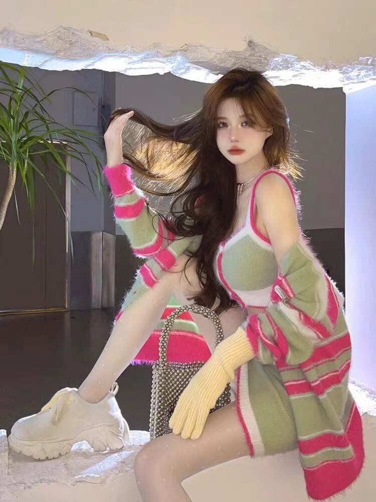 甘いニットストライプカーディガン + キャミソール + スカート 3 個スーツ女の子セーターコート + ベスト + ミニスカートセット衣装 大人ガーリー スウィート キュート カジュアル