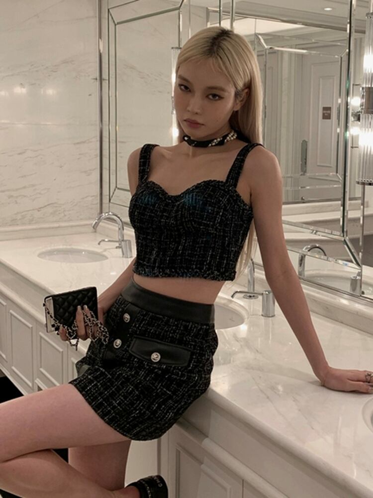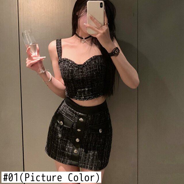 フランスの小さな香りツイード 2 点セットのセクシーなノースリーブ ベスト クロップ トップ + ミニ スカート セット HotSweet 2 ピース スーツ 大人ガーリー スウィート キュート カジュアル