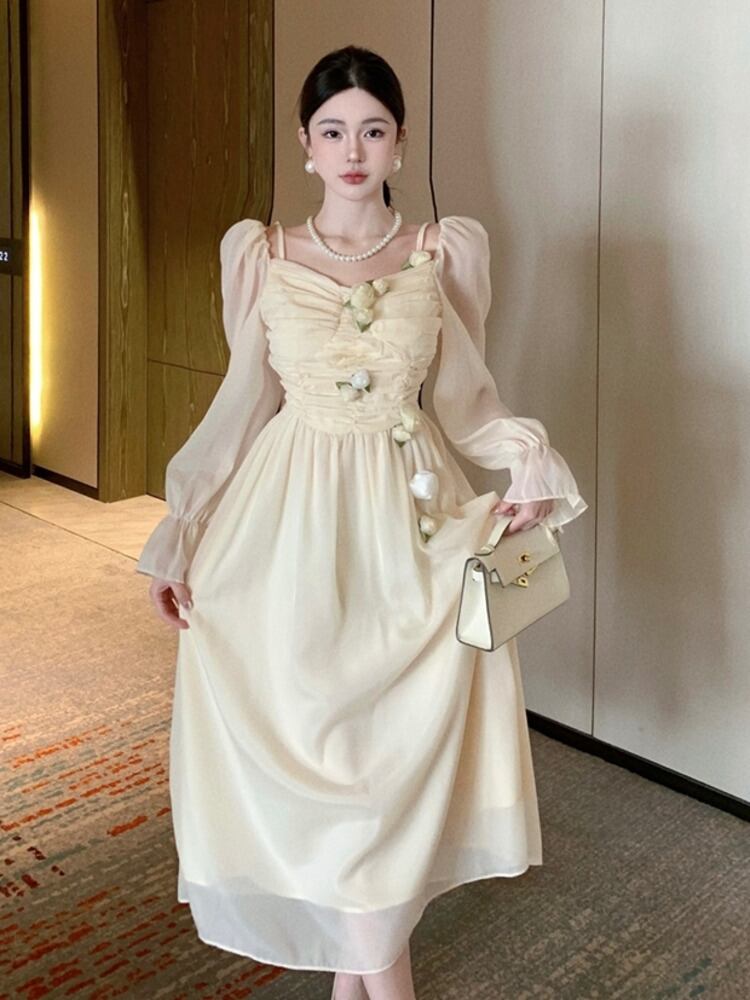 シフォン 3D 花柄甘いサマードレスビーチホリデードレスロリータオフショルダー妖精パーティードレス 大人ガーリー スウィート キュート カジュアル 夏物