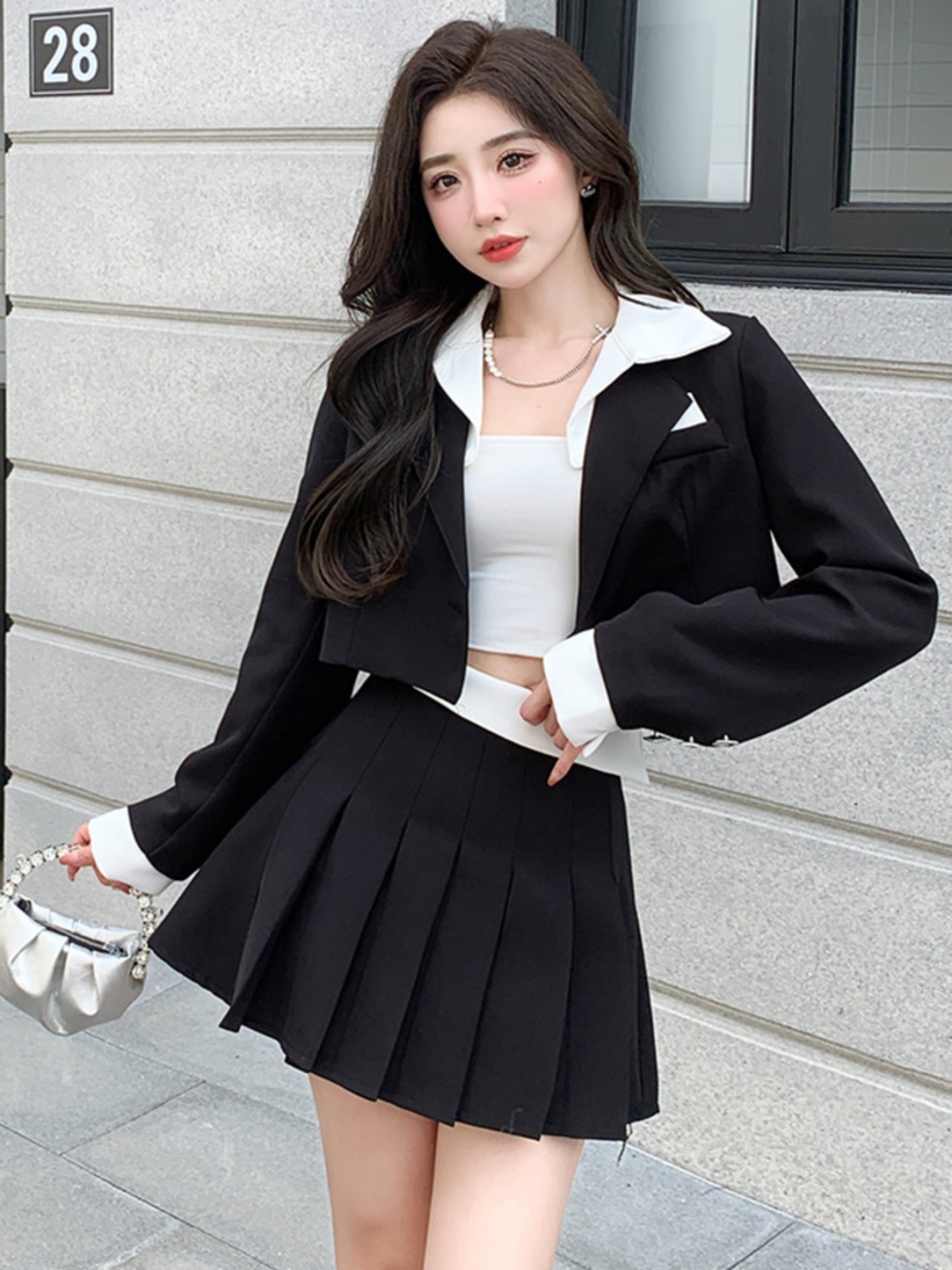 ツーピースセットショートブレザーコートクロップトップ + プリーツスカートスーツ春オフィスレディ 2 点セットの衣装 スプリング 春物 会社 学校 通勤や通学にも