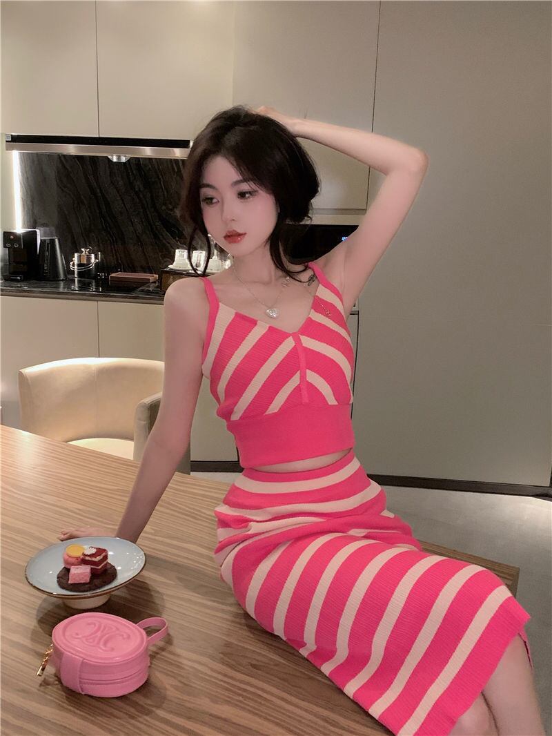 ストライプ ニット 2 点セット衣装セクシーなベスト トップス + ロング スカート スーツ夏ツーピース スーツ サマー 夏物