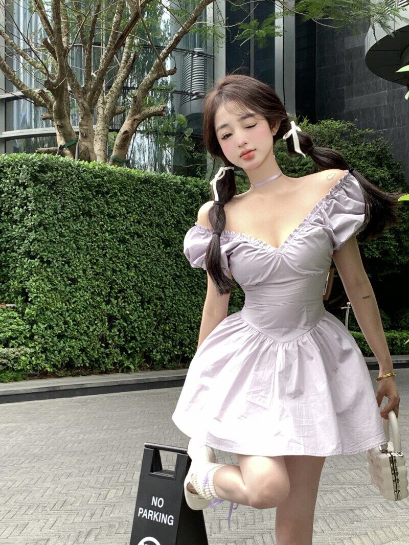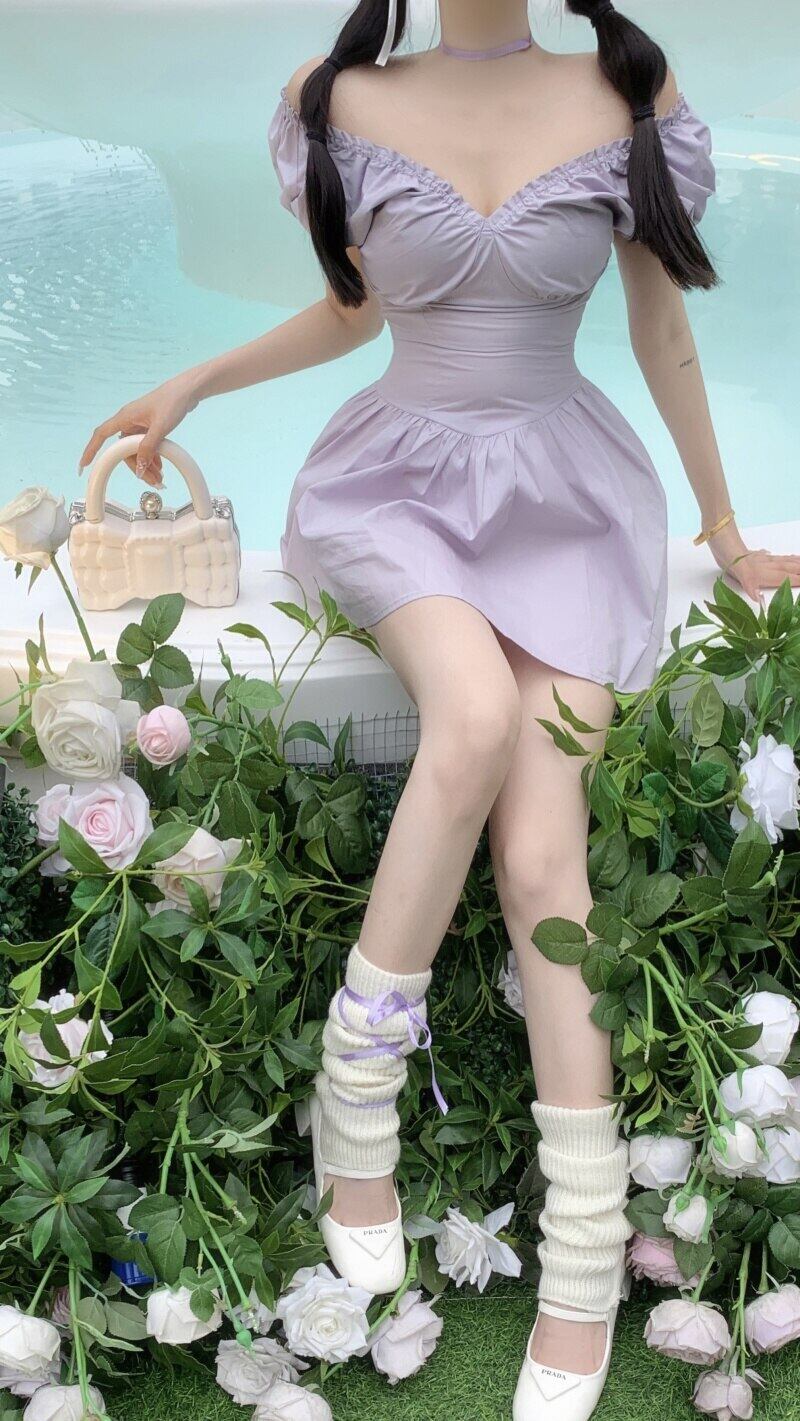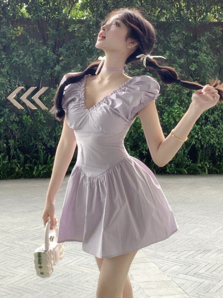 甘いかわいいラベンダーミニ夏のドレスののスタイルのシックな V ネックスリムプリーツサンドレス Vestido Feminino 大人ガーリー スウィート キュート カジュアル サマー 夏物 Vネック